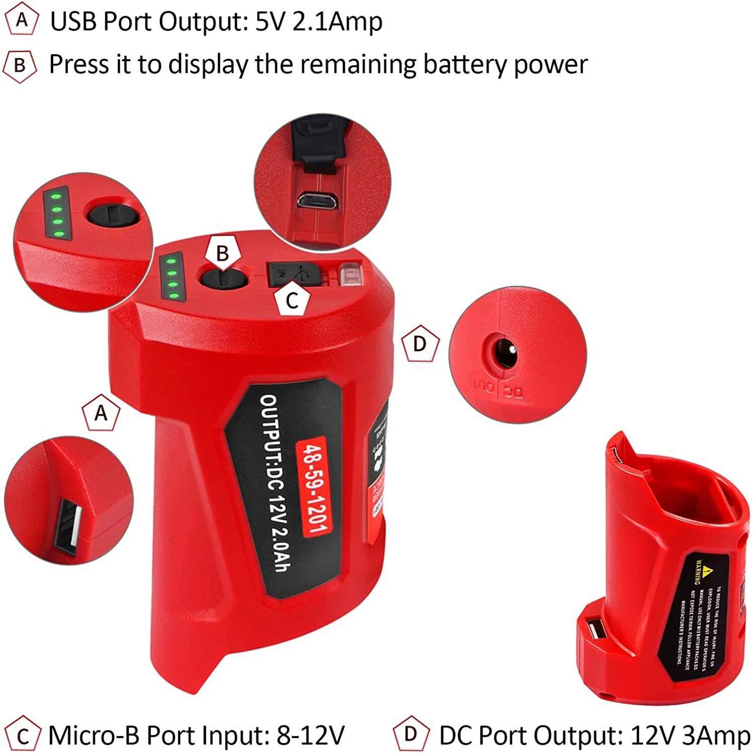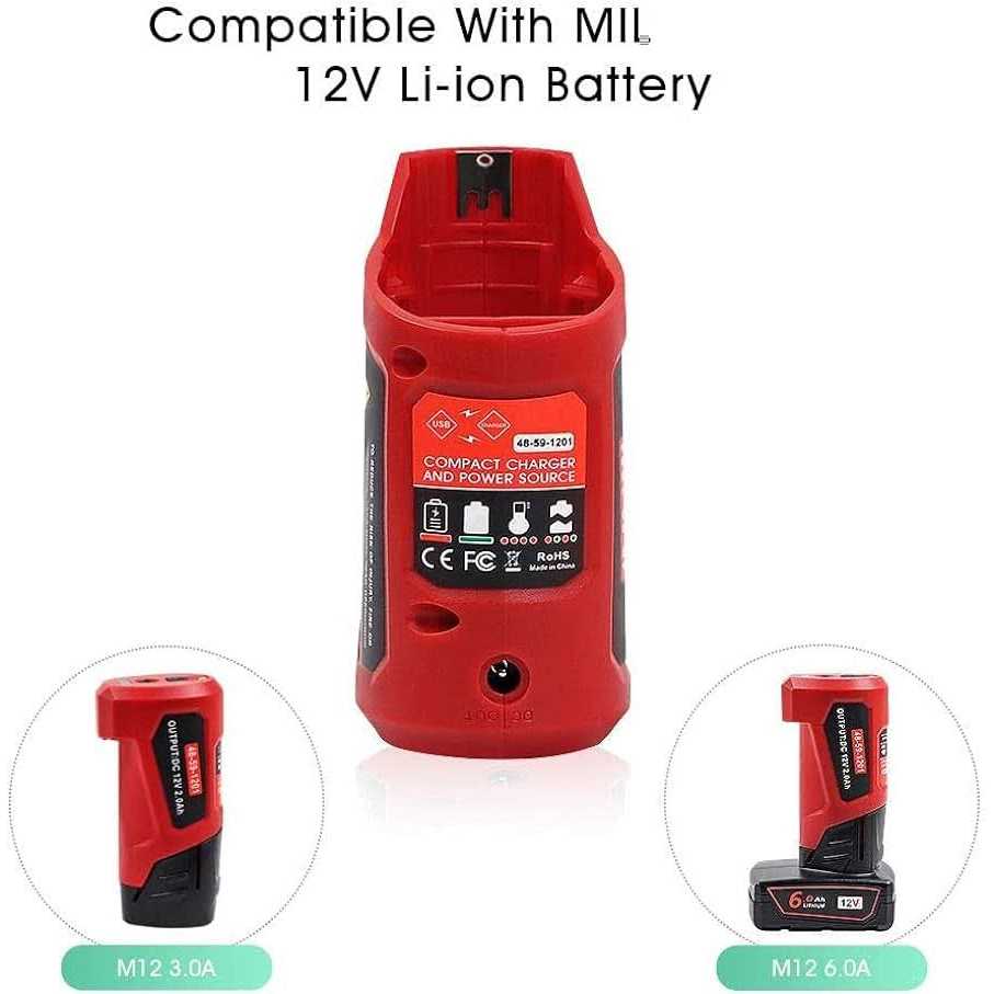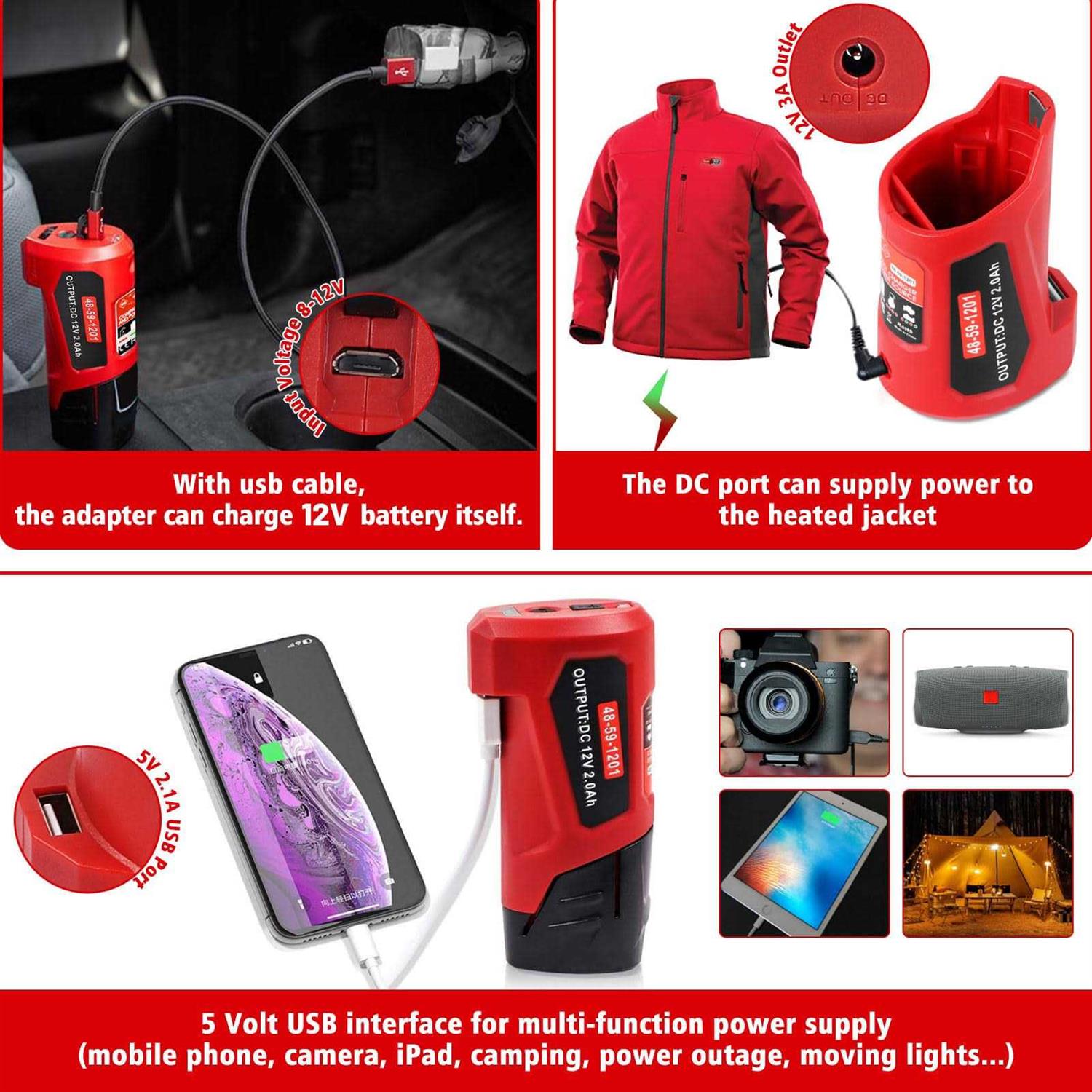 12V USB Power Source Replacement for Milwaukee M12 12V Lithium-Ion Battery Charger Adapter Compatible with Milwaukee Heated Jacket 45-59-1201 USB Charge Item Dimensions LxWxH 3.14 x 2.95 x 0.98 inches Input Voltage 5 Volts €Function]This power source transforms for Milwaukee M12 battery into a portable charger with two USB outlets to allow charging of a wide range of small electronic devices. €High Compatibility]100% compatible For Milwaukee original M12 12V Lithium batteries. Compatible with in-vehicle usb ports for convenient on the go charging of m12 batteries. €Compact & Portable] 2.1A usb port can be charges yours portable electronic devices from M12 Battery.Work with your Milwaukee heated jacket.Fuel Gauge allows fast checking of M12 battery charger. €Safety features]Built-in safeguards protect your devices against excessive current, overheating, and overcharging.Durable Enough To Withstand Jobsite Abuse. What You Get ]1* Ten Battery Chargers by TenHutt. Details:1A/3A. Output Voltage: USB Interface 5V/2.1A, DC Interface 12V /3A. Made with high quality ABS , easy to Use and Easy to Handle. 2.1A USB port to charge cell phones,mp3 player and other portable electronic.