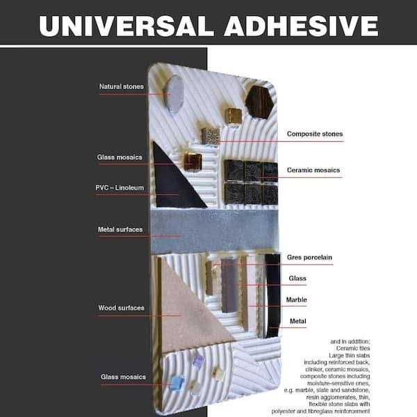 High-performance, white, two-component reactive adhesive for laying floors and walls indoors and outdoors of any type of ceramic tile, including reinforced thin slabs, mosaics, natural and reconstituted stone even on non-traditional substrates, such as wood, metal and fiberglass. Suitable for installations over existing tiles, on heated floors and in swimming pools. Product with ultra-low volatile organic compound (VOC) emissions. White two-part flexible reactive adhesive, water- and solvent-free, with high water repellency. Component A consists of synthetic resins, fine-grain inert aggregates and specific organic additives. Component B consists of an innovative organic catalyst. Once mixed together, the two components form an easily workable, thixotropic and particularly smooth paste that facilitates the work of installers.