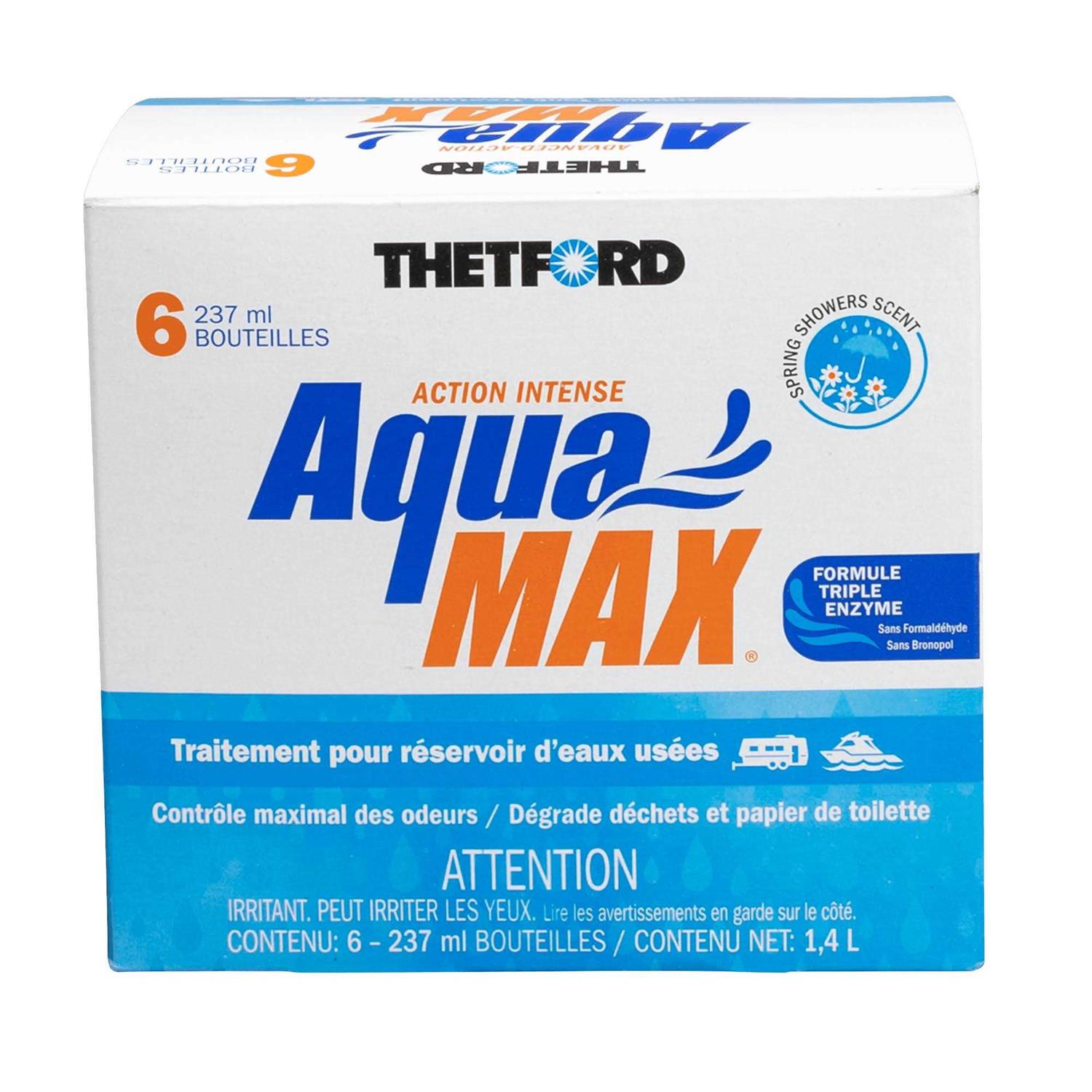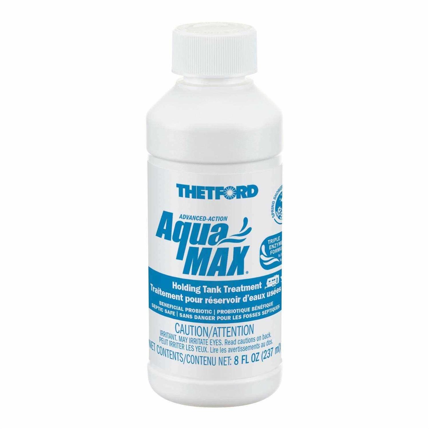 Make the best out of every camping trip with Thetfords AquaMAX RV and Marine holding tank treatment. Designed to neutralize odors, our triple enzyme formula AquaMAX Spring Showers 6 x 8-oz liquid ensures efficient waste digestion while preventing clumping, clogging, and tank residue buildup. Formaldehyde and Bronopol Free, our RV toilet chemical is safe for marinas, campgrounds, and septic systems, meeting California compliance standards. Works with RV/ Marine holding tanks and is easy to use: just pour the liquid directly into the toilet and flush 8 oz of AquaMAX Spring Showers effectively treats a 40-gallon holding tank. Please note that it takes a bit of time for the bacteria and probiotics to start working. Formulated with beneficial probiotics and bacteria, AquaMAX is compliant with all regulations. Easy to store, AquaMAX Spring Showers comes in an easy to recognize white and blue box and contains 6 doses of black holding tank treatment.
