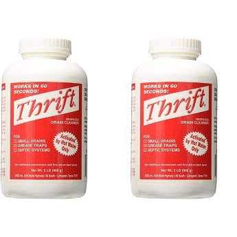 The usual cause for sluggish drains is a build-up of grease, hair, soap scum or bath oils. Most drain cleaners require 2 to 6 hours (or overnight) for results. THRIFT will liquefy hair and grease in less than 60 seconds! HOT water activates THRIFT’s white, dry, odorless crystals. Within 60 seconds the drain is clear- even on the most difficult drain blockage. Thrift is also great for sewer lines, grease traps and septic systems. THRIFT’s non-acid formula will not harm fine fixtures, porcelain, chrome trim, polished brass, plastic or metal pipe. This product is highly durable. This product adds a great value. This product is manufactured in United states Key Product Features. THRIFT works on drains, sewer lines, grease traps, and septic systems. THRIFT will clean out a drain line in less than 60 seconds!