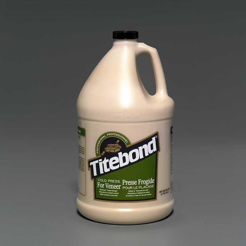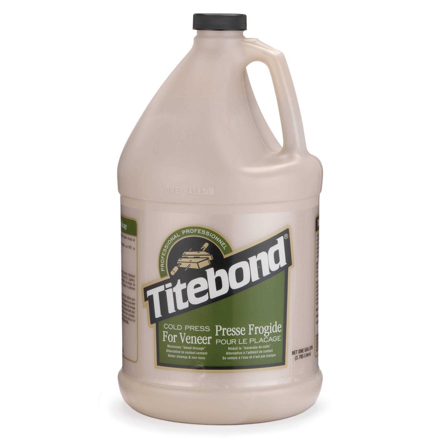 Titebond Cold Press glue is a high-quality, economical alternative to contact cement for large-scale bonding of veneers to flat surfaces. It is specifically formulated for cold press laminating of wood to solid woods, particleboard, MDF, plywood and other porous materials. It offers a moderate speed of set, a translucent glue line and contains none of the harmful or corrosive fumes typical of most contact cements. It also prevents bleed-through on open-grained and non-backed wood veneers. Set time is usually 15 minutes at room temperature, allow 24 hours full cure.
