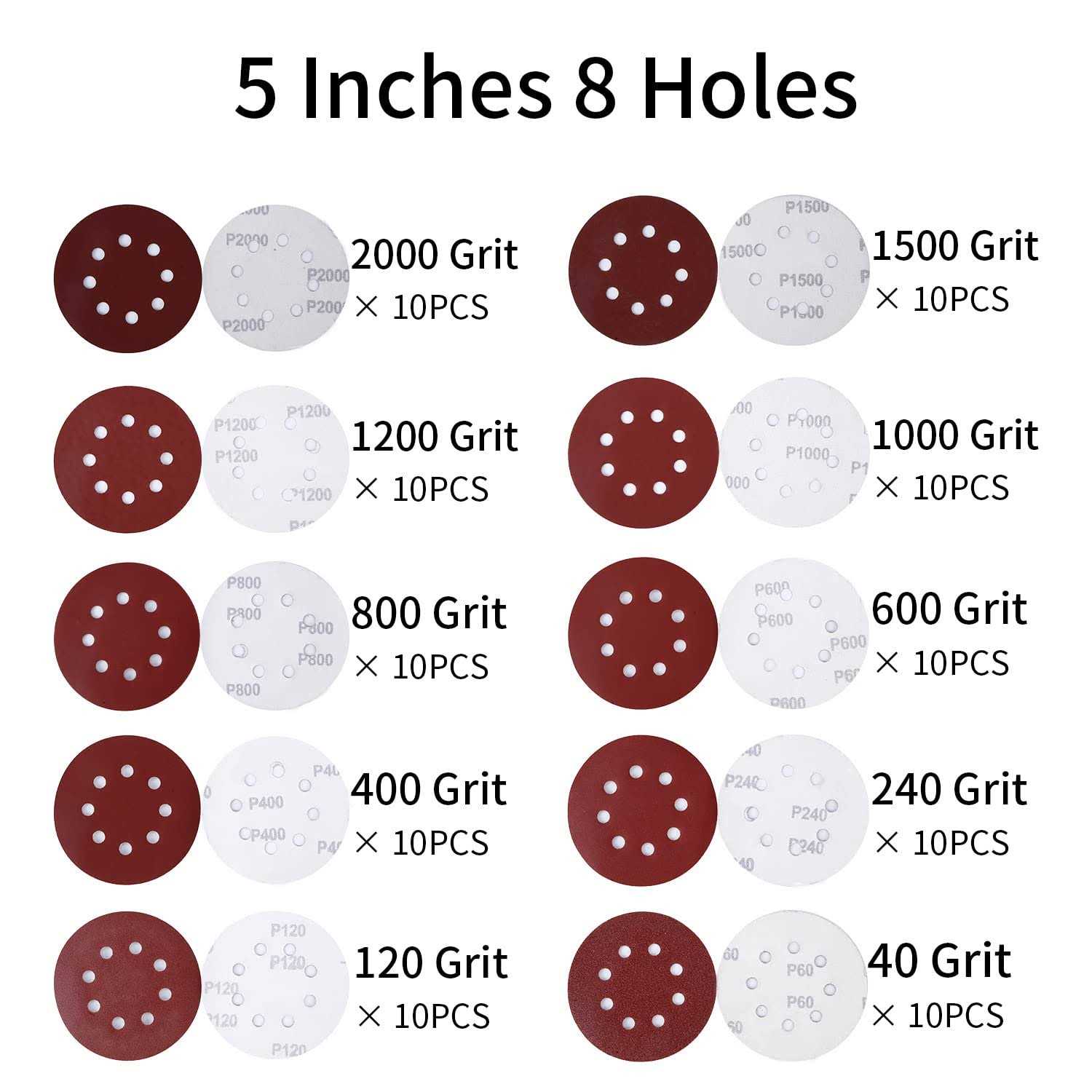 - Meet All Your Need:100pcs 60# 120# 240# 400# 600# 800# 1000# 1200# 1500# 2000# grit 5in sanding discs assortment pack, each grit 10pcs.