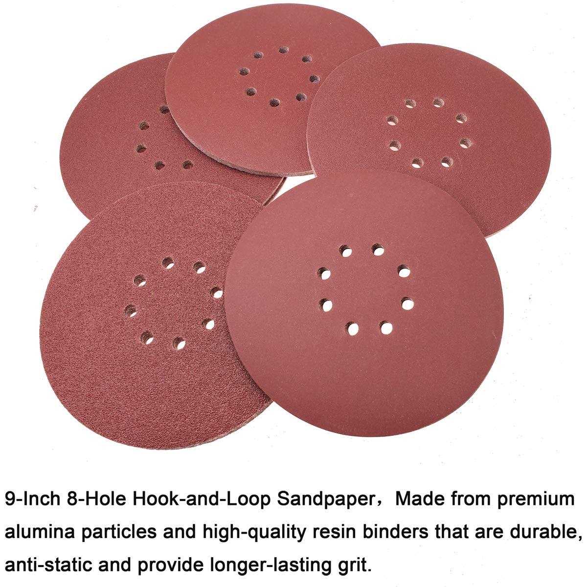 Tonmp 100 Pcs 9-Inch 8-Hole Hook-and-Loop Sanding Discs Sander Paper for Drywall Sander (20 Pcs Each of 60 80 120 150 240 Grits)