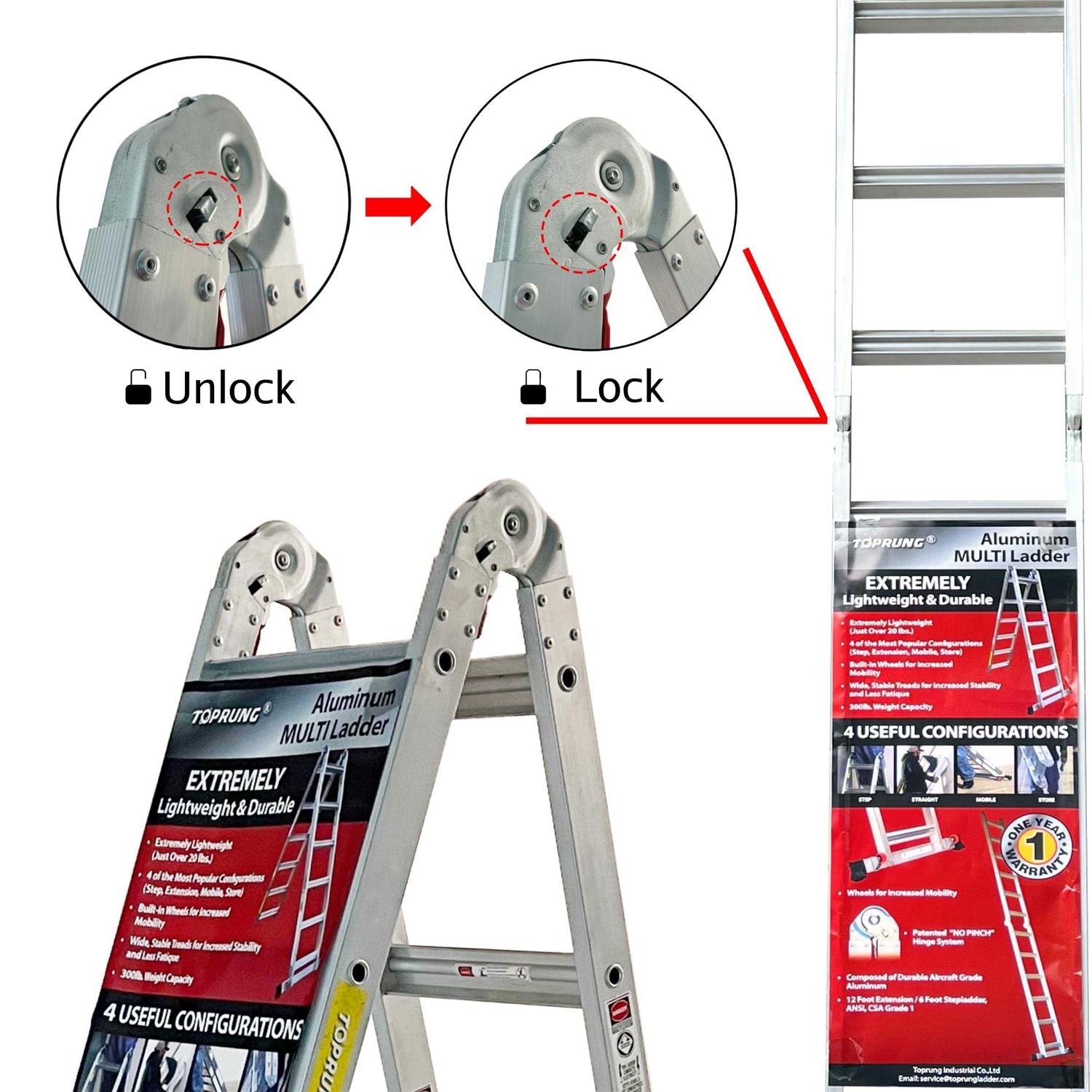 TOP LADDER TOPRUNG: Toprung is a professional manufacturer with over 20 years of high quality ladder. All our products are produced according on international standard,EN-131,AS/NZS 1892.1,ANSI 14.2,and BSEN 14975. Specification: Standard: ANSI A14.2 Load Rate: Type IA Extension Height: 12 Feet A-frame Height: 6 Feet Storage Height: 6.10 Feet Bottom Width(feet): 1.24 Feet Packing Size(feet): 6.10*1.24*0.42 Product weight(pounds): 21.4 Pounds Caring for your Toprung Ladder: 1. When storing the ladder, place in a dry location out of the weather. This will enhance the life of your ladder. 2. Keep the hinge mechanism clear of dirt, salt spray, or other contaminants that could obstruct proper operation. 3. To ensure safety,replace the inner and outer feet when required. Add to cart ,TOPRUNG will be your reliable partner!