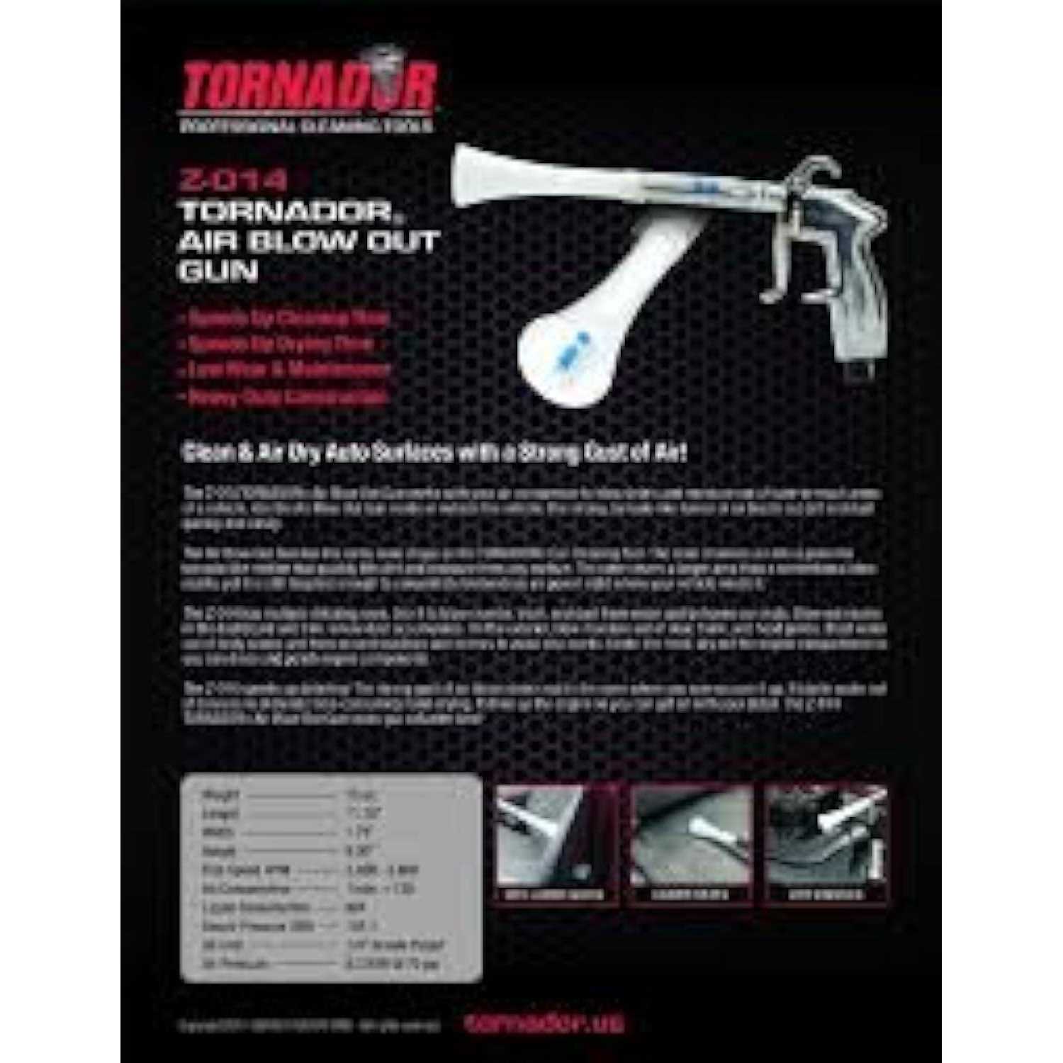Works the same way as the Tornador Cleaning Tool Uses tornado-like motion Multiple Car Detailing Uses Exterior drying tool The Tornador Air Blow Gun Z-014 is a versatile tool that can help you blow water off of your vehicle and help you clean the interior with a powerful stream of air when attached to your air compressor! To help you fully dry your vehicle it will blow water off or out of virtually any area imaginable. Inside, outside, it does not matter, Z-014 makes quick work of pesky water droplets. It can be used on large flat panels like your hood or tight crevices that are impossible to dry with a towel. The secret is in the tornado shaped funnel. This cone channels air into a powerful tornado like motion that quickly pushes or blows water out of seams, trunk jamb, door jambs, windows, mirrors, spoilers, front grill, etc. This tool is not just for removing water, use it to remove dust and debris from the interior too. Use it as you start your interior detail to clean your vents, trim, seat crevices, carpets, under the seats, center console, buttons, cup holders and so many more tough to reach areas. The clean air safely removes dust and dirt for a more thorough cleaning. The Tornador Air Blow Gun easily connects with virtually any air compressor operating between 60 and 90 psi and with one simple pull of the trigger you’ll amazed at the strong burst of air it provides.