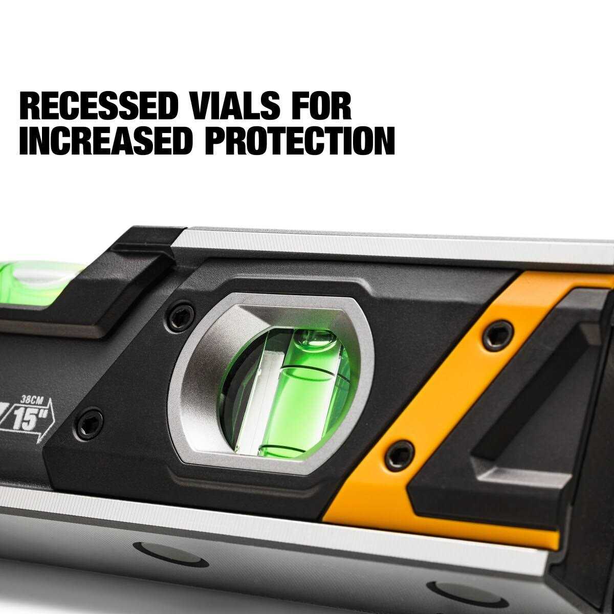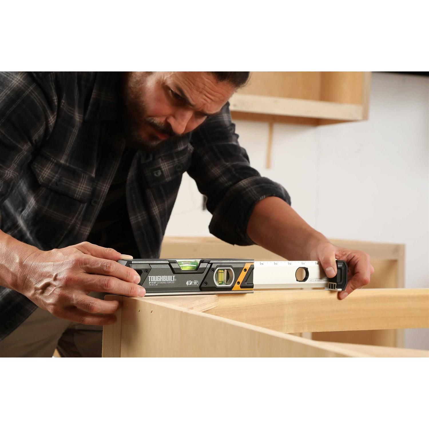 Precision-milled aluminum frame delivers the strength and accuracy required on the jobsite Shock-absorbing end caps for added impact protection Wide frame profile for increased stability while measuring Full-width extension with enlarged slide lock for ultimate slide control Beveled vial openings combined with rear-side vial window ensure an unobstructed view from challenging angles The versatile 9′′ Extending Box Level is a precision-milled powerhouse designed to meet Pros’ rigorous standards. This portable 9′′-to-15′′ extending level is ready to handle any jobsite environment and packs away to a portable 9 inches with a snap, providing durable accuracy anywhere it’s needed.