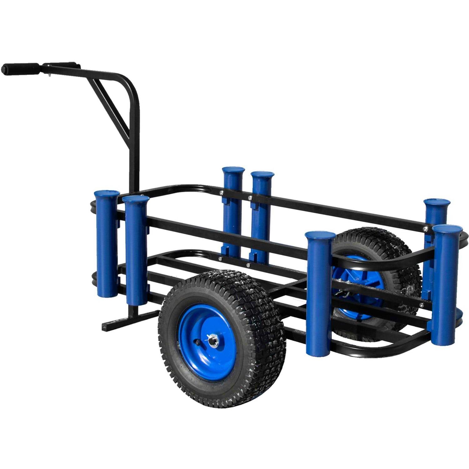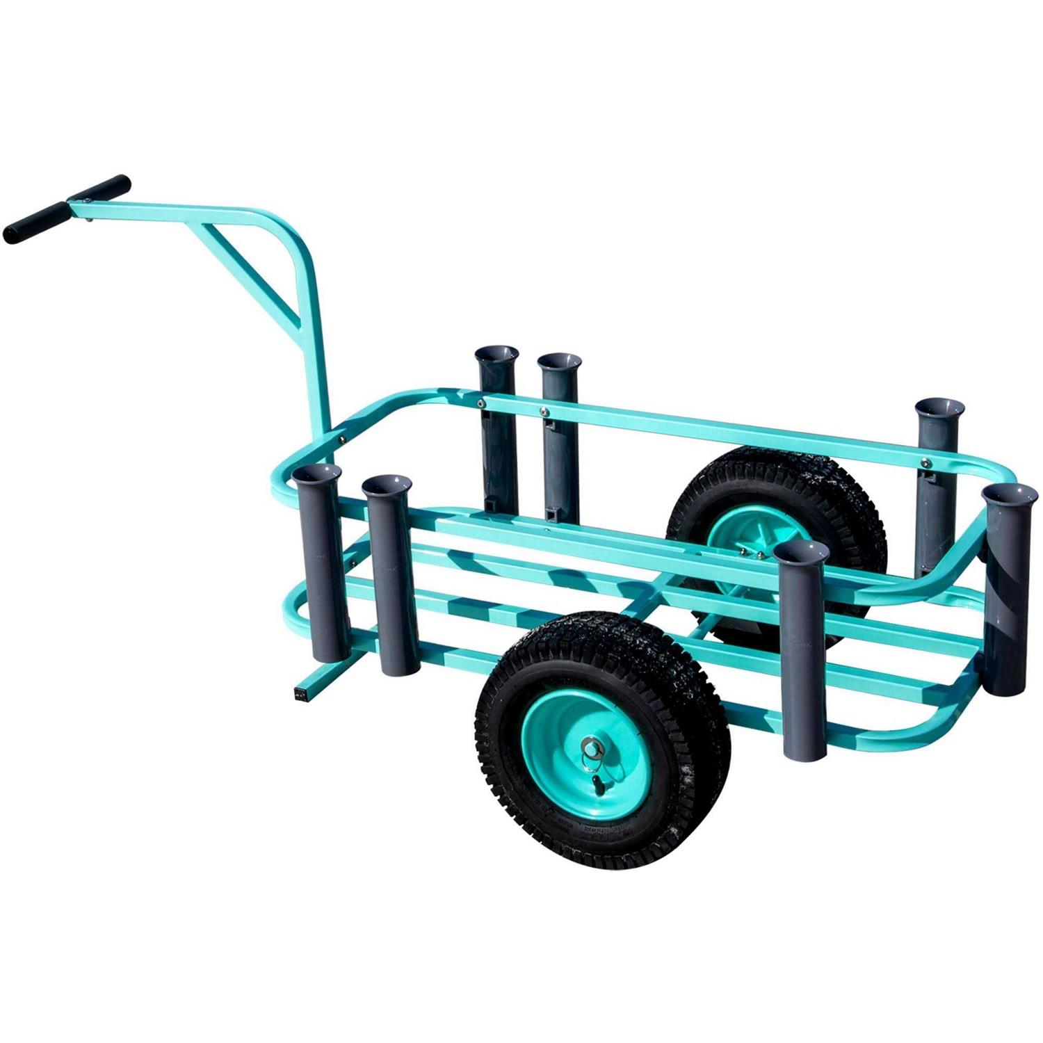 FEATURES: Built with a galvanized steel frame and finished with a powder coat that protects against salt and sand, ensuring long-lasting durability Features pneumatic wheels for smooth and easy maneuverability, even over rough terrain Built to hold up to a 54 QT. cooler and comes with seven PVC rod/accessory holders Plenty of space to store all your gear and refreshments Color: Seafoam.