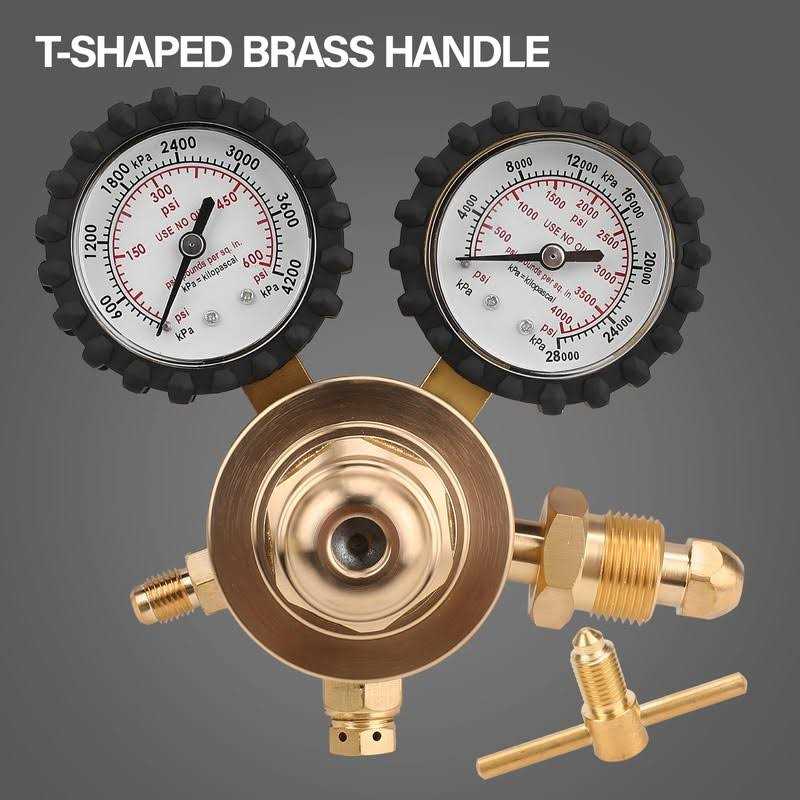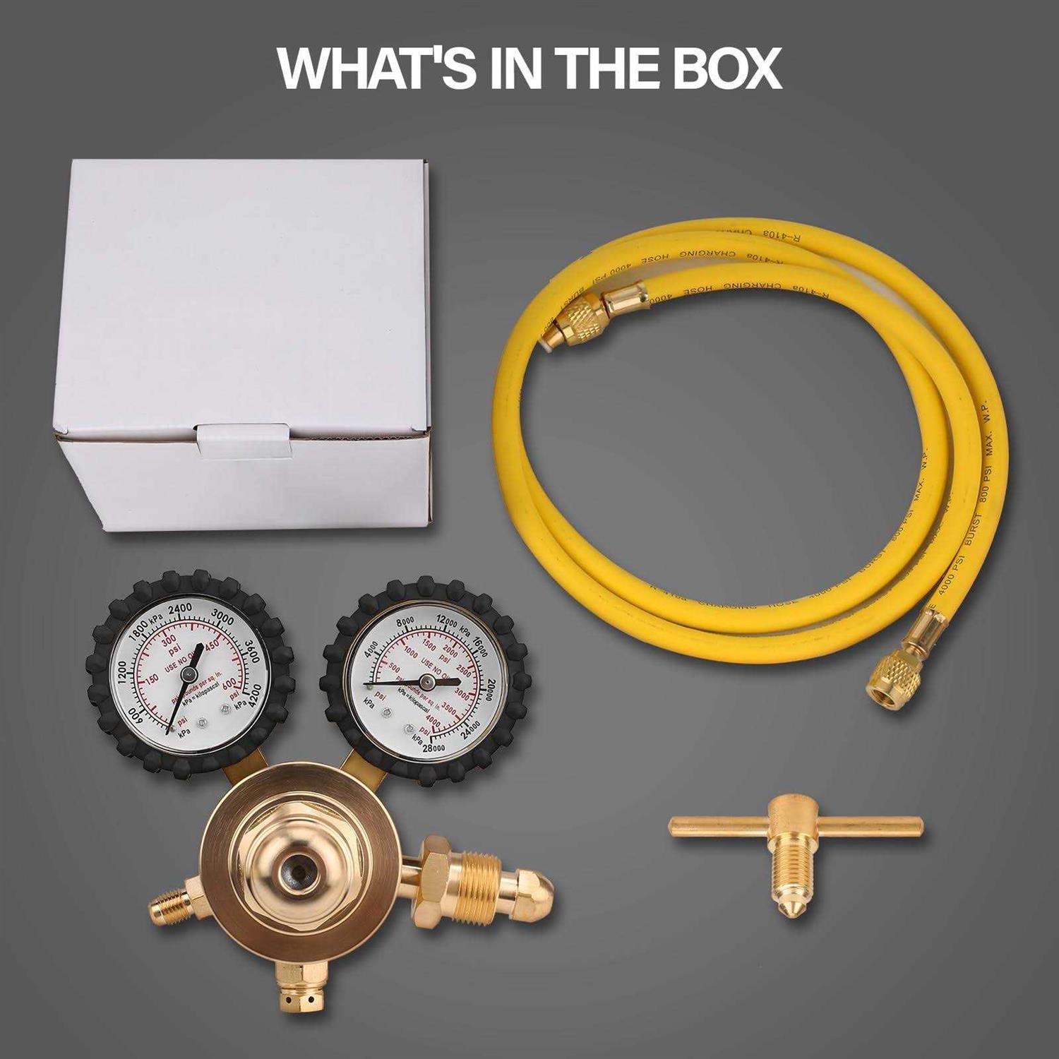 【Connection】CGA-580 Inlet Connector fits standard Nitrogen, Argon, Helium, and Inert Gas Tanks from any supplier. 1/4-Inch Male Flare Outlet Connection fits HVAC Charging Hoses for HVAC unit pressure checking and purging. The 80″” (6.6FT) hose will give you a safe distance to avoid injury. 【Accurate Pressure Gauge】This pressure Nitrogen Regulator has two easy to read 2 inch pressure gauge with scratch-resistant plastic protective film and rubber cover. Input: 0-4000PSI. Output: adjustable 0-400PSI. NOTE: The gauge shows 600PSI that you can rate them at 400PSI, but they are able to go up to 600PSI. 【Application】The Nitrogen regulator is a standard pressure control valve used to reduce the input pressure from gas or liquid stored in a pressurized tank. It is great for HVAC purge, pressure test for air conditioning, leakage tests, soldering and keg beer distribution. The accurate reading of Nitrogen Regulator would help you to adjust pressure before HVAC purging. 【Durable Construction】Our Nitrogen Regulator is made of brass, durable brass piston designed diaphragm. This upgraded surface treatment process can keep good looking in long time. Precision thread design ensures high sealing performance and avoids air leakage. You can adjust the nitrogen regulator smoothly and accurately through the T-handle to prevent galling. 【Filter Structure】The connection part adopts a filter structure, which can effectively prevent the debris in the nitrogen tank from entering the gauge with the airflow, ensuring the normal operation of the gauge and increasing the service life.”