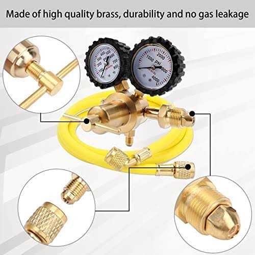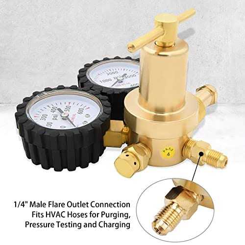 【Connection】CGA-580 Inlet Connection fits standard Nitrogen, Argon, Helium, and Inert Gas Tanks from any supplier.1/4″ Male Flare Outlet Connection fits HVAC Charging Hoses for Purging ,Pressure Testing and High-pressure lines. 【Accurate Pressure Gaugev】The Nitrogen Gas Regulator has two Easy to read pressure gauge,covered with scratch-resistant plastic protective film and rubber cover.Input: 0-4000PSI.Output: adjustable 0-600PSI.The display show 800PSI that you can rate them at 600PSI, but they are able to go up to 800PSI. 【Durable Construction】Our Nitrogen Regulator is made of solid brass,so the surface can keep good looking in a long time. Precision thread design ensures high sealing performance and avoids gas leakage. You can adjust the nitrogen regulator smoothly and accurately through the T-handle to prevent galling. 【Application】The Nitrogen regulator is a standard pressure control valve that reduces the input pressure from a liquid or gas stored in a tank.It is great for HVAC purging,pressure tests,inertization,leakage tests,and Soldering,like the accurate reading of Nitrogen Regulator would help you to adjust pressure before HVAC puring. 【Filter Structure】A filter structure is used at the connection, which can effectively prevent debris in the nitrogen tank entering the gauge with the airflow.It helps ensure the normal work of the gauge and increase the service life.