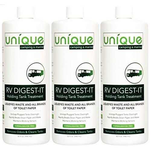 Sewer Chemicals & Cleaners by Unique. Details:Enjoy your RV. Leave your holding tanks to us. Stop wasting time worrying about your holding tanks and spend more time enjoying your RV! RV Digest-It is powered by the strongest bacteria and enzyme formula available today. More than a deodorizer, RV Digest-It RV black tank enzyme treatment will ensure your tanks remain free from odor, waste buildup, and clogs. Does your RV toilet treatment work? Breaking down solid waste is a must for a good holding tank treatment. Nearly every brand of black tank treatment for RVs claims to break down solid waste inside holding tanks, but does your brand of RV toilet chemicals live up to its claims? RV Digest-It RV black tank treatment is not only used by thousands of RVers every single day but is also the #1 recommended waste tank treatment by RV techs. The strongest all-around camper septic tank treatment, dissolves human waste and all brands of toilet tissue, a bio-enzymatic toilet odor eliminator…