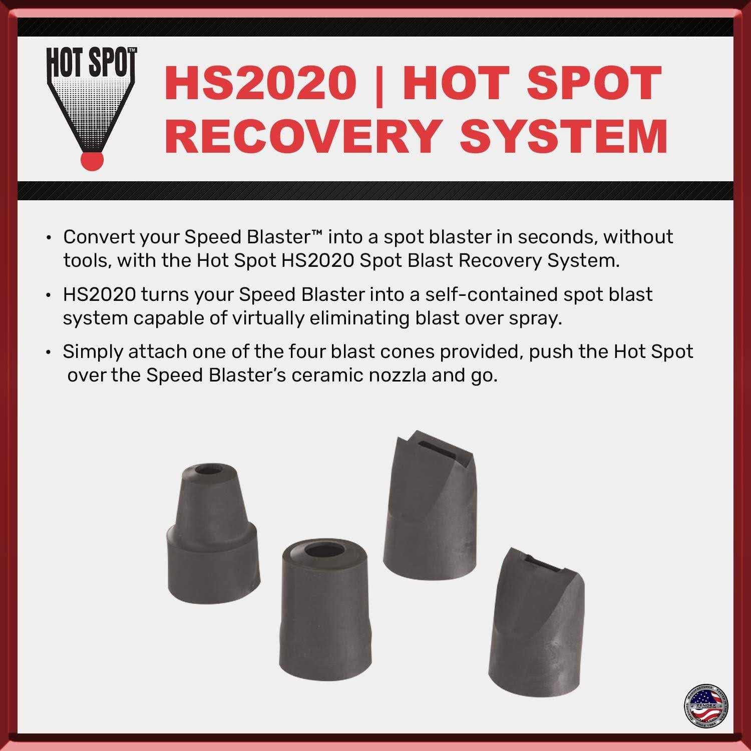 Convert your Speed Blaster into a spot blaster in seconds, without tools Attach one of the four blast cones provided, push the HotSpot over the Speed Blaster’s ceramic nozzle and go Individual shapes of the four blast cones conform to any surface The blast media, rust, scale and debris are instantly directed into the breathable collection bag The system will virtually eliminate debris and dust, which reduces cover-up and clean-up time Convert your Speed Blaster into a spot blaster in seconds, without tools, with the Hot Spot HS2020 Spot Blast Recovery System. HS2020 turns your Speed Blaster into a self-contained spot blast system capable of virtually eliminating blast overspray. Simply attach one of the four blast cones provided, push the HotSpot over the Speed Blasters ceramic nozzle and go. The individual shapes of the four blast cones conform to any surface. Hold the HS2020 blast cone tightly to the work piece and pull the trigger. The blast media, rust, scale and debris are instantly directed into the breathable collection bag. Used correctly, the system will virtually eliminate debris and dust, which reduces cover-up and clean-up time. When the collection bag is full, simply remove the blast cone and shake contents out. Its that easy.