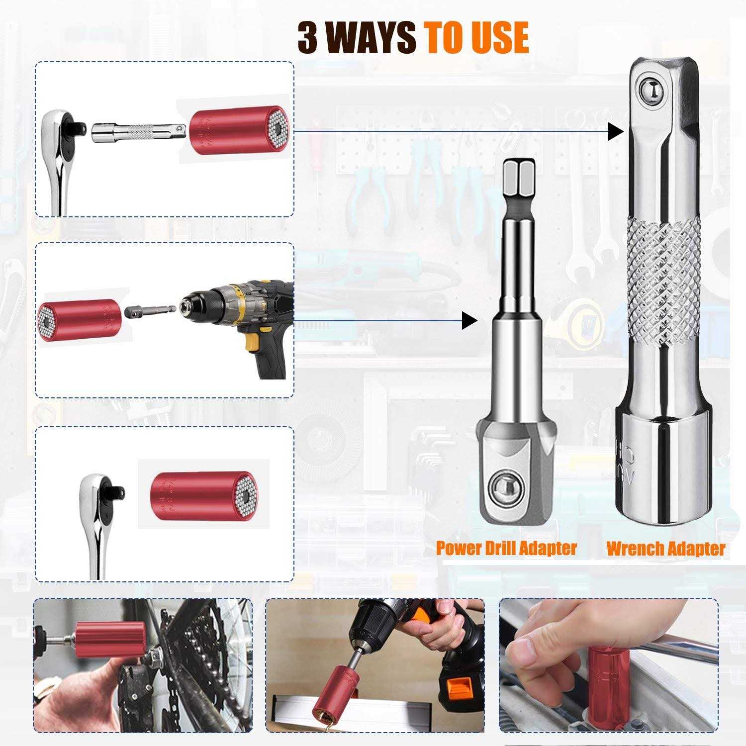 AUTO ADJUST DESIGN: Unique design automatically adjusts to any size or shape, suitable for standard 1/4 to 3/4inches and metric 7mm to 19mm screws, meeting all your needs, compact and easy to carry. EFFICIENT VERSATILE USE: URGENEX super socket is perfect for automobile industry, home maintenance, manufacturing, construction and other industries, also favored by home decoration DIY design enthusiasts. Suitable for all types of nut bolts(rings bolts, square nuts, rotating hooks, hexagons, wing nuts, broken nuts) PREMIUM QUALITY DESIGN: The universal socket is made of chrome vanadium steel, Each socket contains 54 steel spring pins, the hardness can reach 58HRC, compact and durable. ONE SIZE FITS MOST: URGENEX upgraded universal socket can automatically adjust to any size or shape, suitable for standard 1/4 to 3/4 inches and metric 7mm to 19mm with no more than 450NM torque screws, nuts, and blots, meeting all your needs. Also it’s compact and lightweight design so you won’t have to carry multiple heavy socket tools. Choose URGENEX, saving time and energy for your Men. WHAT YOU GET: 2xUniversal Socket, 2xPower Drill Adapter and 2xWrench Adapter. Description: /b br Muti-function Design br This wrench bushing set delivers accurate appliance and extended bolts compatibility suitable for any kind of repair work. br It can easily handle all kinds of nut bolts, like hex nuts, screws, square nuts, rotating hooks, bolts and bolts of various shapes etc. br br Specifications: /b br Color: Red br Material: Chrome-vanadium steel br Surface Treatment: Polishing chromed br Using Range: 1/4″-3/4″(7-19mm) br Item Dimension: 5.3*2.9*1.3inch br Item Weight: 272g br br Package Included: /b br 2xUniversal Socket, 2xPower Drill Adapter and 2xWrench Adapter. br NOTE: Do not use the socket adapter individually. It is recommended to use with ratchet wrench or electric drill.