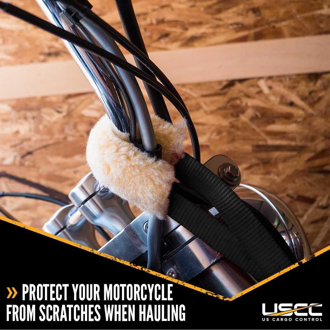 This pair of straps and plush covers is everything you need to protect your motorcycle from scratches when hauling. Simply slide the 1-1/4″x6″ synthetic wool cover over the 1″ black polyester strap and place wherever you want a layer of protection. Straps measure 1″x18″ with loops at each end like a typical handlebar strap, so they can also be used without the covers to secure the bike by the handlebars. The natural chamois color means there are no dyes to rub off on your bike. Straps also sold separately in red or black.