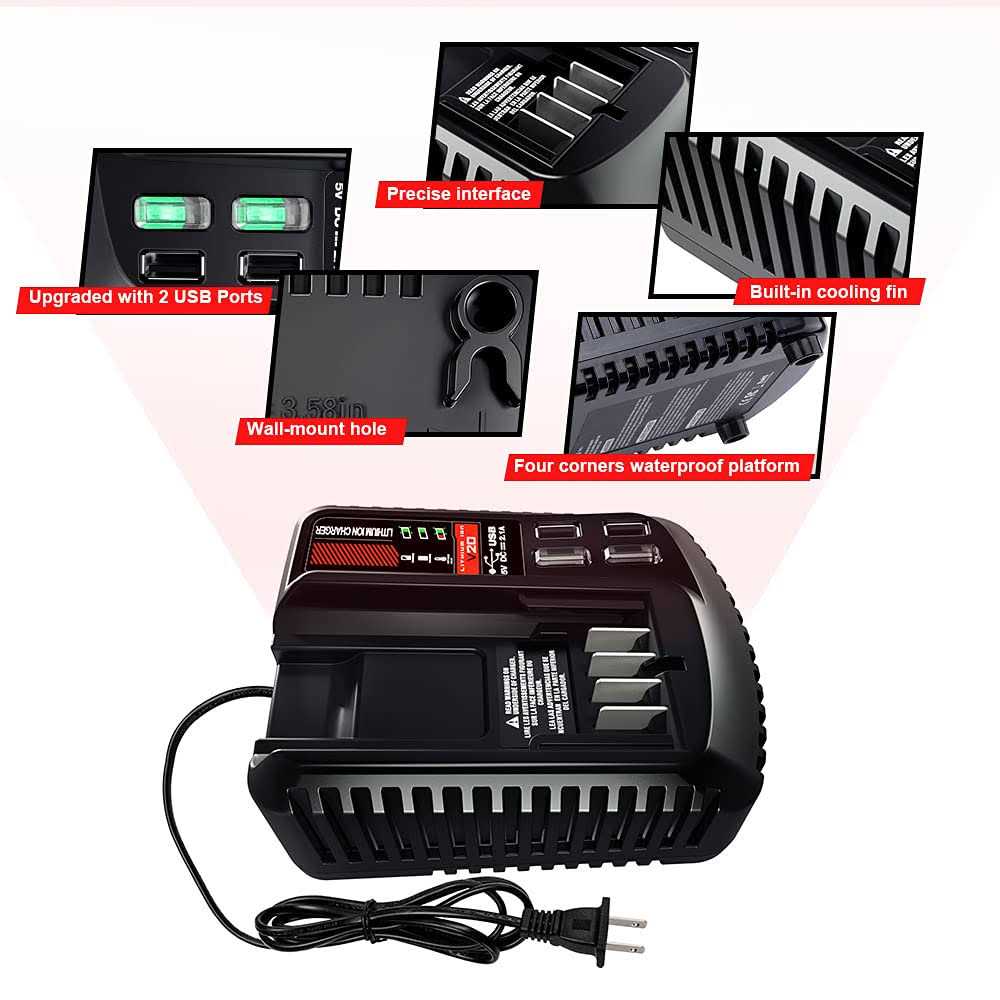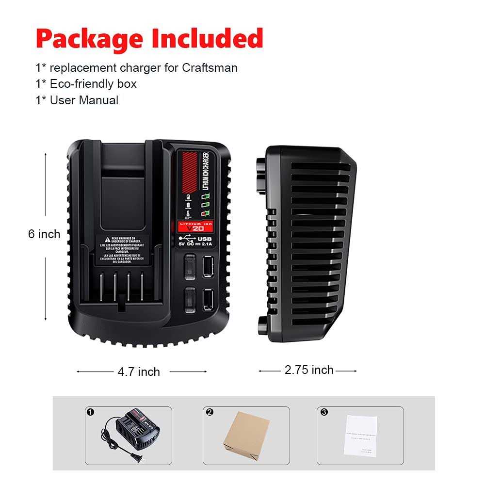 Brand: Waxparfeatures: 【 100% Battery Compatiblity 】—— Compatible With Craftsman 20v Max V20 Lithium-ion Battery Charger Cmcb104, Cmcb124, Cmcb100, Cmcb102, Cmcb101. Charges All Craftsman V20 Lithium Battery Cmcb204, Cmcb202, Cmcb201, Cmcb205, Cmcb209. (not Fit For Bolt-on & Diehard Seried) 【 Fast Charger With Dual Usb Ports】—— Advanced Charging Technology, Universal 110v-220v Voltage Input. Charges V12/v20 Compact Batteries In 75 Minutes Or Less For Jobsite Efficiency. 2 Usb Ports For Charge For Your Electronic Devices, Such As Mobile Phone, Usb Fan Etc. 【 Advanced Heat Dissipation 】—— Bulit-in Cooling System With Vents On The Three Sides Circulate Air Across The Batteries To Cool Down The Heat During Charging. And Extends Batteries Cycling Times For Long Lifespan. 【 Led Indicator To Monitor Battery Status 】 —— Cmcb104 Battery Charger For Craftsman With Indicator Lights To Show The Battery Status. Built-in Charger Diagnostic Program Checks Batteries With Every Charge To Optimizes The Battery Life And Performance. 【 Safety Assurance With Ce Fcc Certified 】—— Cmcb104 Rapid Charger Comply With Fcc Rohs And Ce Security Testing Standards. Advanced Technical Supports To Protect Against Over-charge, Short-circuit, Over-heat, Over-load And Low-voltage. Details: Lenmax Cmcb104 Cmcb102 20v Battery Charger Compatible With Craftsman V20 Lithium Battery Cmcb204 Cmcb202 Cmcb201 Cmcb209 Cmcb205 Cmcb100 Cmcb101ean: 0789219309837package Dimensions: 6.3 X 5.6 X 3.1 Inchespart Number: Cmcb102-gj”
