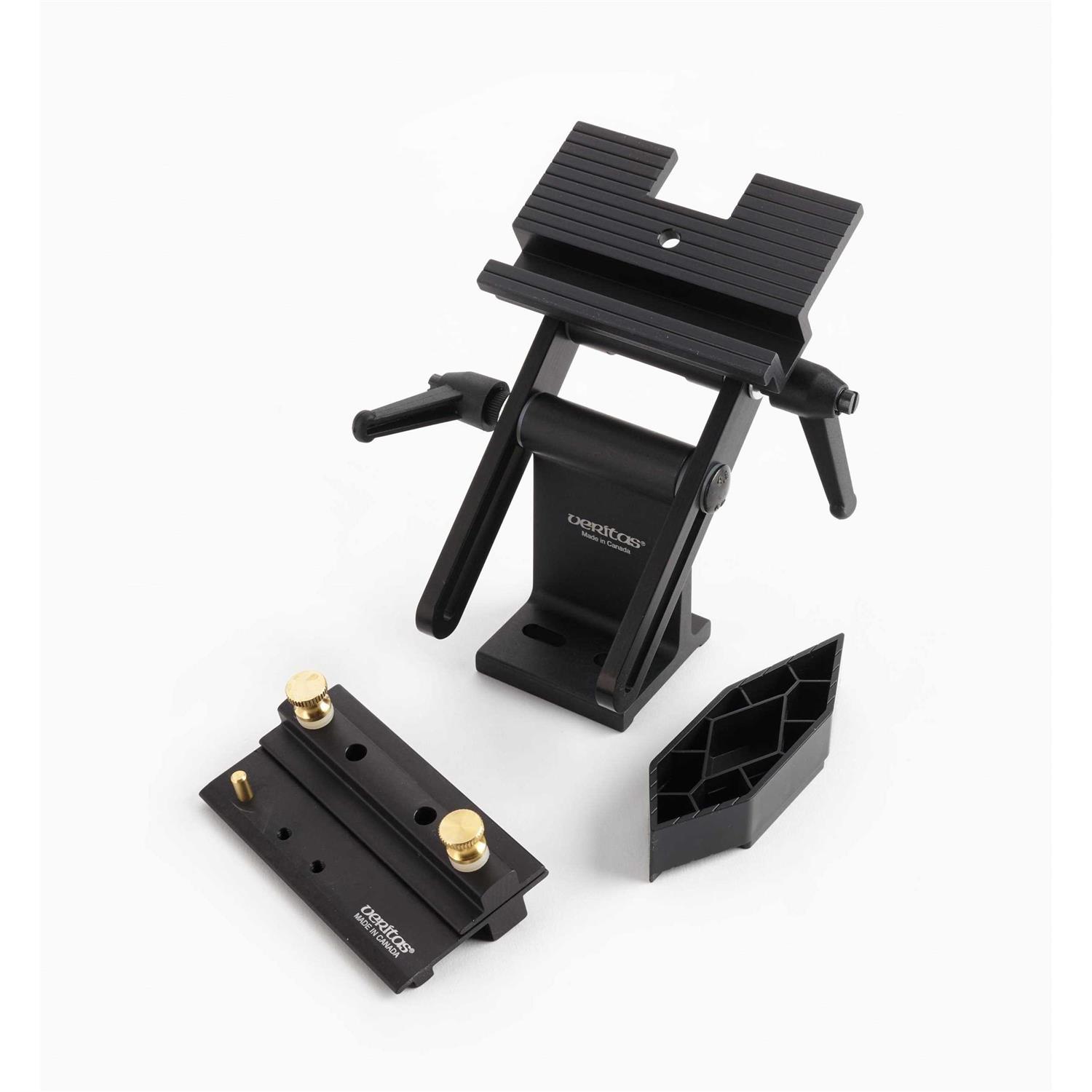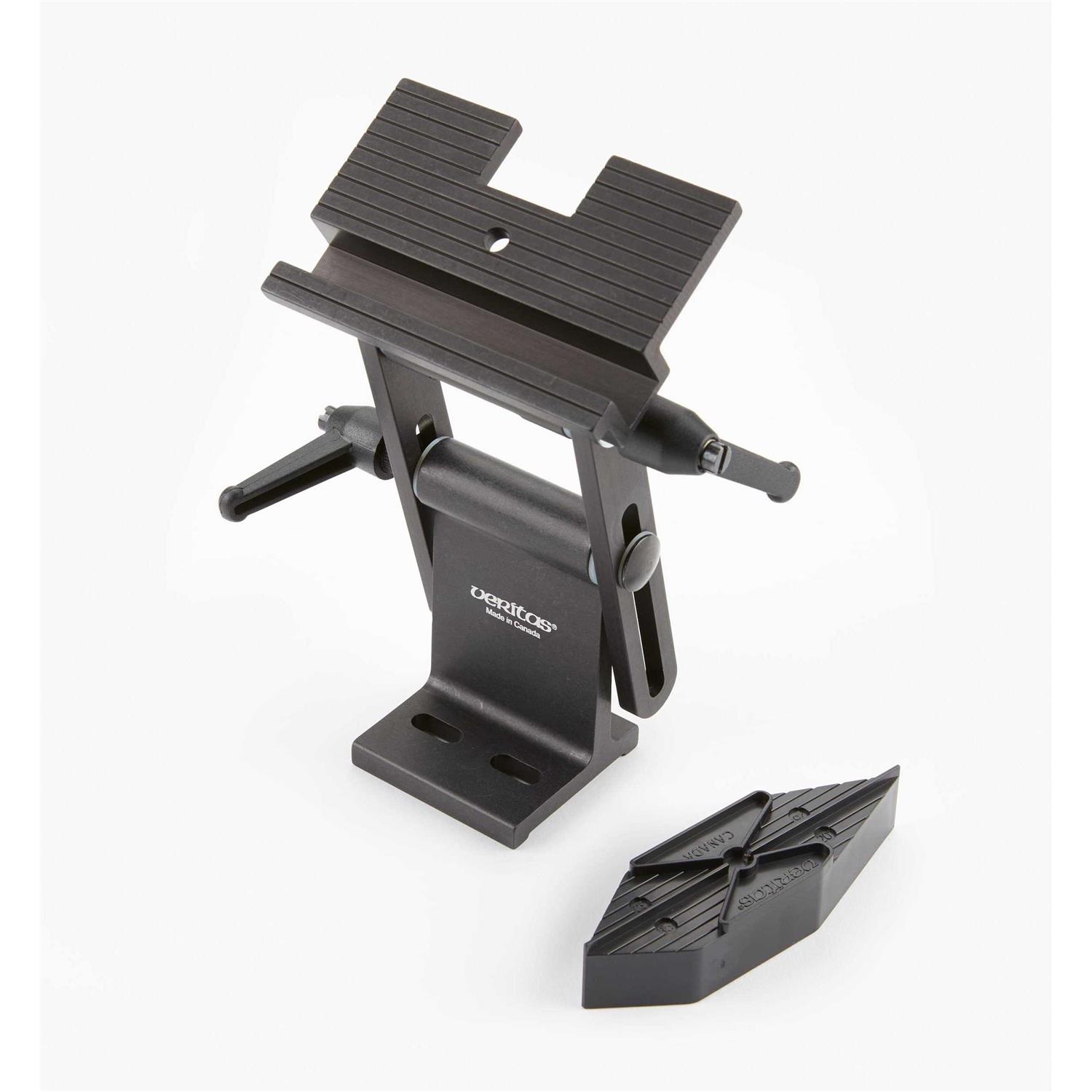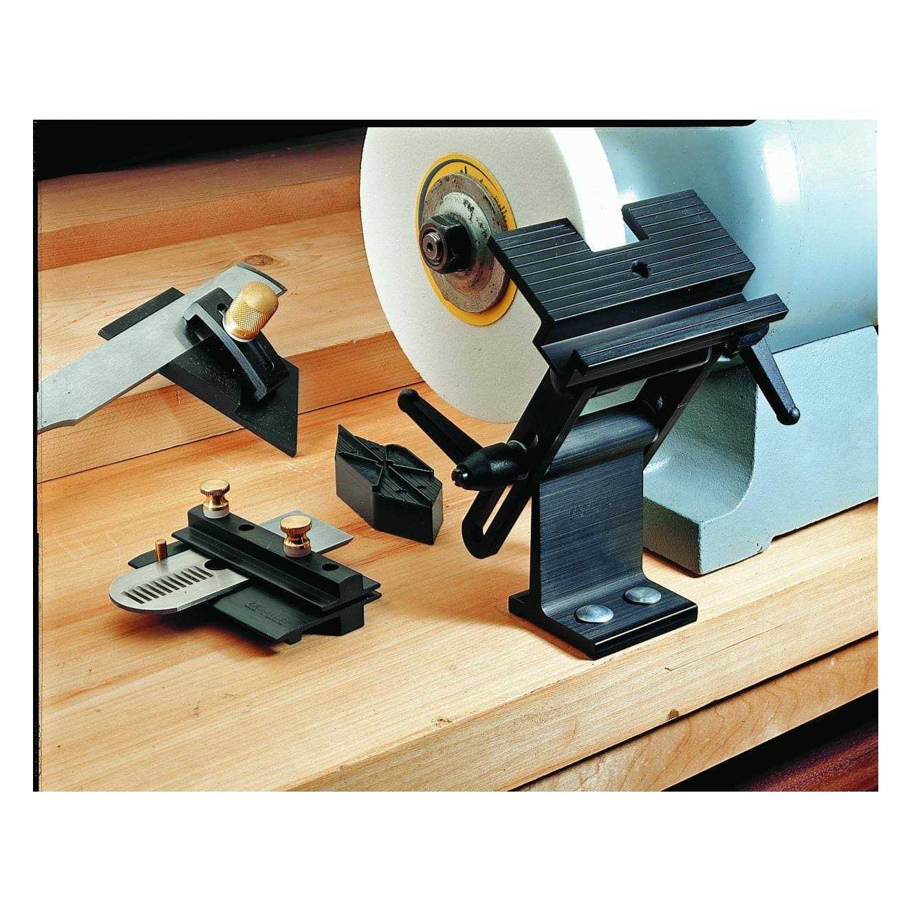 The major weakness of most bench grinders is that the tool rests are virtually useless. It is nearly impossible to find one with a rest that is solid and square. The Veritas Grinder Tool Rest can be used with 6″ or 8″ utility bench grinders and many belt sanders/grinders. It mounts directly to the bench in front of the grinder and can be readily folded out of the way for freehand grinding. The 4″ wide table straddles wheels up to 1″ wide. It is grooved for sliding jigs and center drilled for rotating jigs. The slotted arms allow a wide range of angular and height adjustments. Spring-loaded gyratory handles lock it solidly in position and can be rotated out of the way after locking. You can easily move it from one grinder to another or quickly remove it from the bench. Accurately machined, anodized aluminum construction. It is completely compatible with the Veritas grinding jig and skew-grinding jig. Included is an angle-setting gauge to set the table to the common bevel angles of 20°, 25°, 30° and 35°. Available as a set with our grinding jig. Made in Canada.