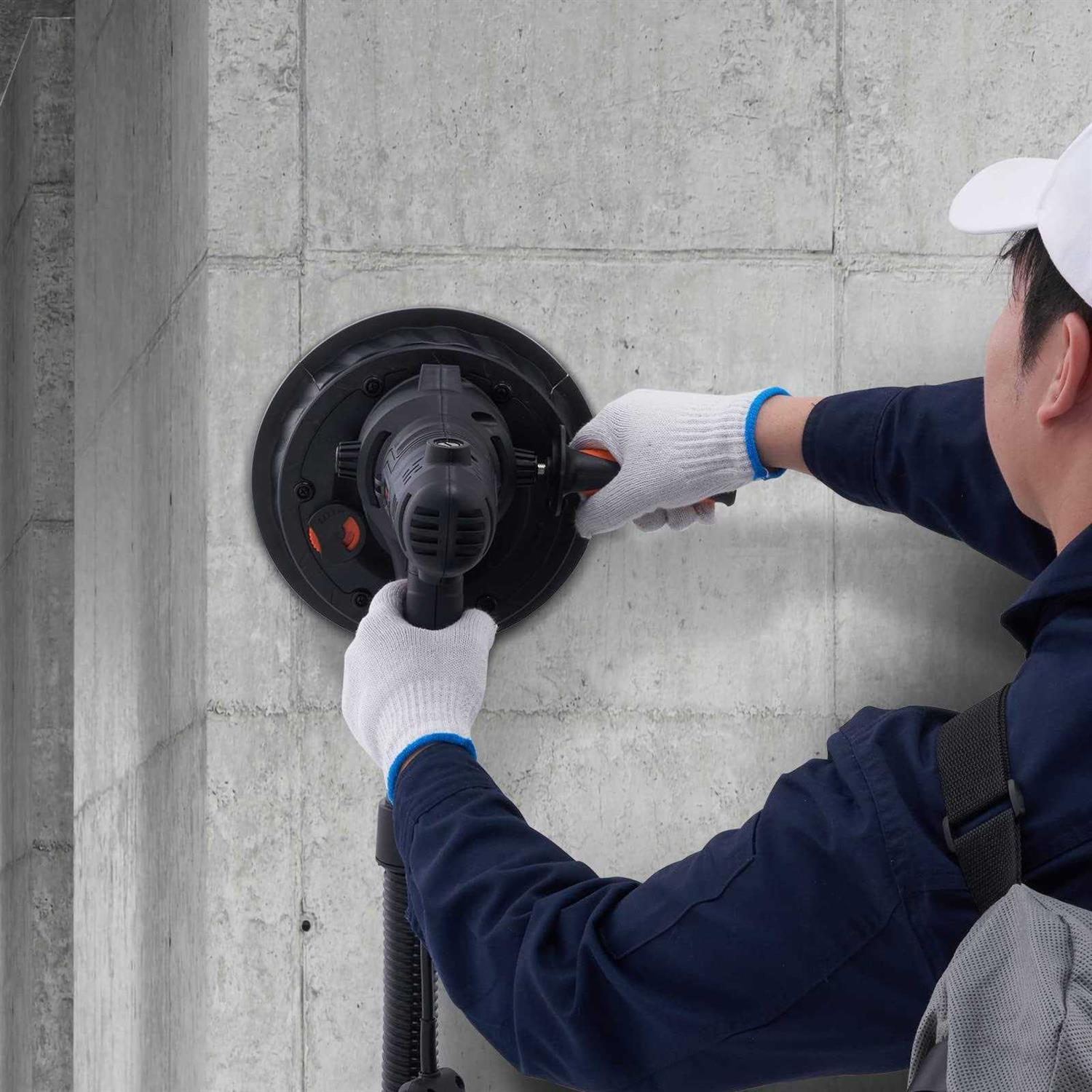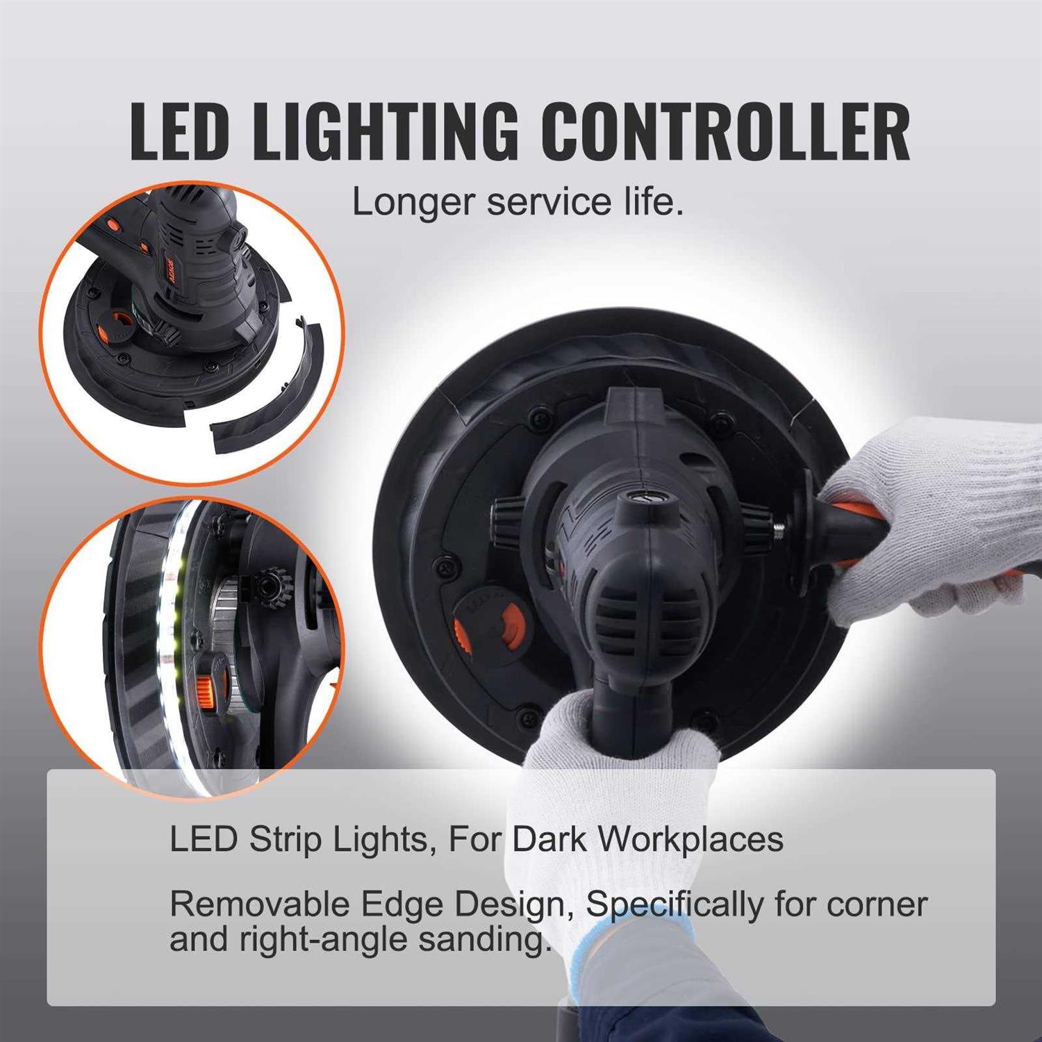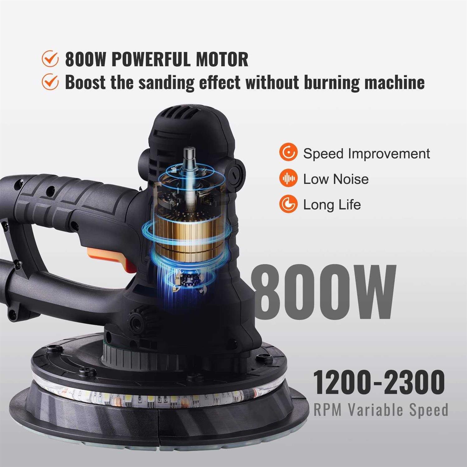 Widely Applicable: VEVOR versatile drywall sander is a highly optimized tool for achieving smooth and polished surfaces. It is suitable for various surface, including latex walls, paint walls, silicate walls, atomic ash, and putty wall lamps. A great wall sander for both DIY home projects, professional renovation and construction work. Sanding Faster and Smarter: 800w brush motor provides a powerful suction force, with a longer and more stable lifespan than ordinary motors. 1200-2300rpm stepless speed adjustment allows for effortless sanding even on tougher surfaces such as wooden floors. Optimized Ducts for Less Dust: Say goodbye to dust and hello to clean air! Automatic dust removal vacuum system can absorb more than 90% of drywall dust, equipped with a soft hose and suction pipe, and compatible with most vacuum cleaners on the market. Provide you a healthy working environment with our quality electric sander for drywall. All For Your Convenience: The soft rubber auxiliary handle can be assembled on both sides of the ceiling sander, for easier and more labor-saving operation. Enlarged ventilation holes enables quick heat dissipation. Double-layer LED strip provides full coverage lighting to ensure a clear view of the surface being polished. Abundant Accessories: A 180mm large sanding pad with a self-adhesive design for easy sand paper replacement and efficient sanding. Our electric drywall sander also comes with an S5 internal hex wrench, carbon brush, dust bag, dust collection pipe (with a 35 connector), sandpaper, instruction manual, and auxiliary handle.