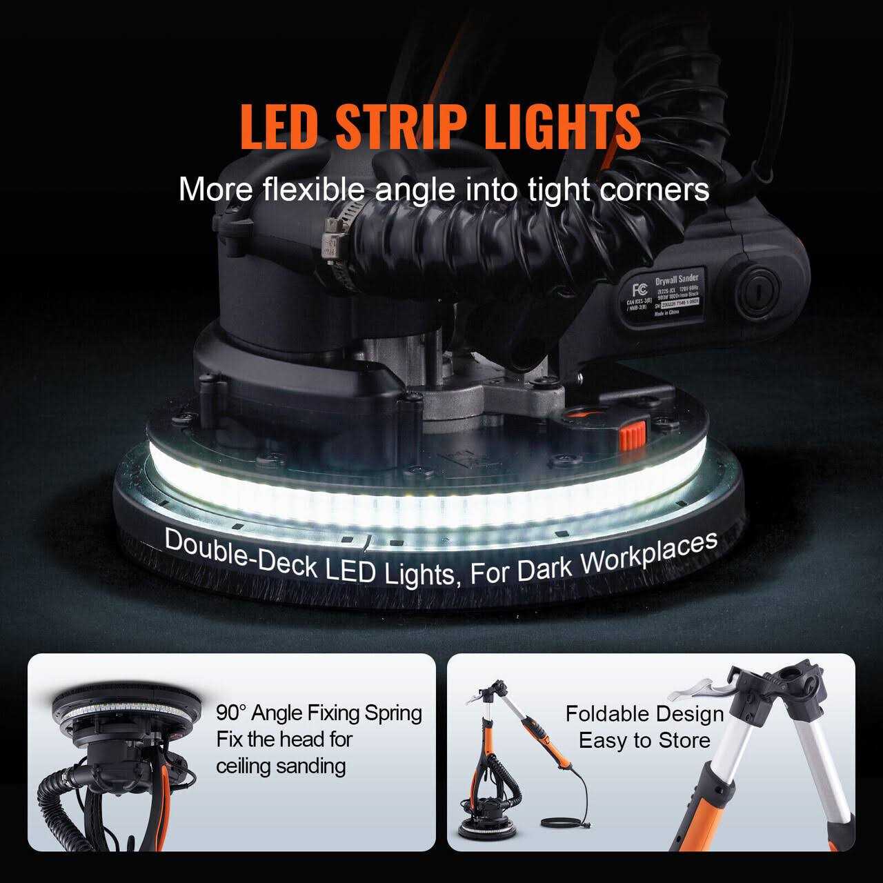 Widely Applicable: VEVOR versatile drywall sander is a highly optimized tool for achieving smooth and polished surfaces. It is suitable for various surface, including latex walls, paint walls, silicate walls, atomic ash, and putty wall lamps. A great wall sander for both DIY home projects, professional renovation and construction work. Sanding Faster and Smarter: 900w suction power with the self-suction function makes for efficient dust and debris collection while in use. It is equipped with a constant power board, and added overload protection, resulting in a longer, more stable, and more efficient lifespan than ordinary motors. 800-1800rpm stepless speed adjustment allows for easy sanding even on tougher surfaces such as wooden floors. Optimized Ducts for Less Dust: 3 optimized suction ports with a 3-fold increase in suction ducts result in a 50% improvement in dust collection efficiency. The electric sander for drywall comes with a hose and suction tube and is compatible with most vacuum cleaners on the market. Unique vacuum suction system can absorb 90% of dust, creating a healthier sanding environment. All For Your Convenience: Weighing only 3.5KG, and greatly reducing labor intensity. 3:7 optimal weight distribution ratio effectively avoids imbalance. Lightweight and extendable pole allows for effortless sanding even in hard-to-reach areas. Double-layer LED strip provides full coverage lighting to ensure a clear view. Foldable electric drywall sander is much easier to store and carry. Abundant Accessories:Our ceiling sander includes a 215mm large sanding pad for efficient sanding, and a 360-degree surround brush to prevent dust from flying around. The package also includes a S5 hex wrench, carbon brush, dust collection bag, dust collection hose, sandpaper, instruction manual, sponge pad, and extension pole.
