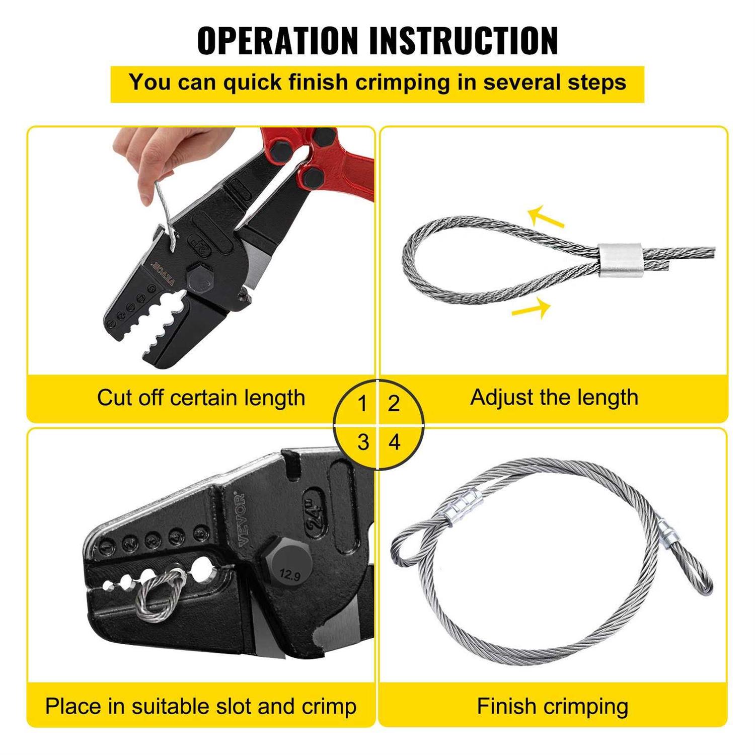 Excellent Crimping Our swage tool features with 5 cavities for diameter of 1/16”, 3/32”, 1/8”, 5/32″ and 3/16″. It gives you a tight and clean compression on each crimping. Wire Cutting Our 24 inch wire rope crimping tool is a two in one device. In case of an inappropriate length, you can cut before crimping. The quick and sharp cutter can cut up to 5/32″ steel cables. Solid Structure Forged alloy steel, heat-treated and polished jaws are durable and solid with high hardness and strength to crimp cables¡asolid material for a long service time. Labor-saving Handle The ergonomic handle with a non-slippery grip is designed to ensure strong holds in any condition. The handle features leverage, making crimp effortless. Crimp in a Breeze Our wire rope crimping tool is easy to use. You just put the wire or rope into the hole and press it. Then you can get a perfect sleeve. Diverse Use This wire crimper tool is suitable for aluminum wire rope, ferrules, crimping loop sleeves, duplex sleeves, double fishing sleeves, railing fittings, etc. Specifications Material: Alloy steel Type: 24 inch Capacity: 1/16″, 3/32″, 1/8″, 5/32″ and 3/16″ sleeves Package size: 66x15x4cm/26x7x2inch Gross weight: 7 lbs Package Content 1 x Hand swager