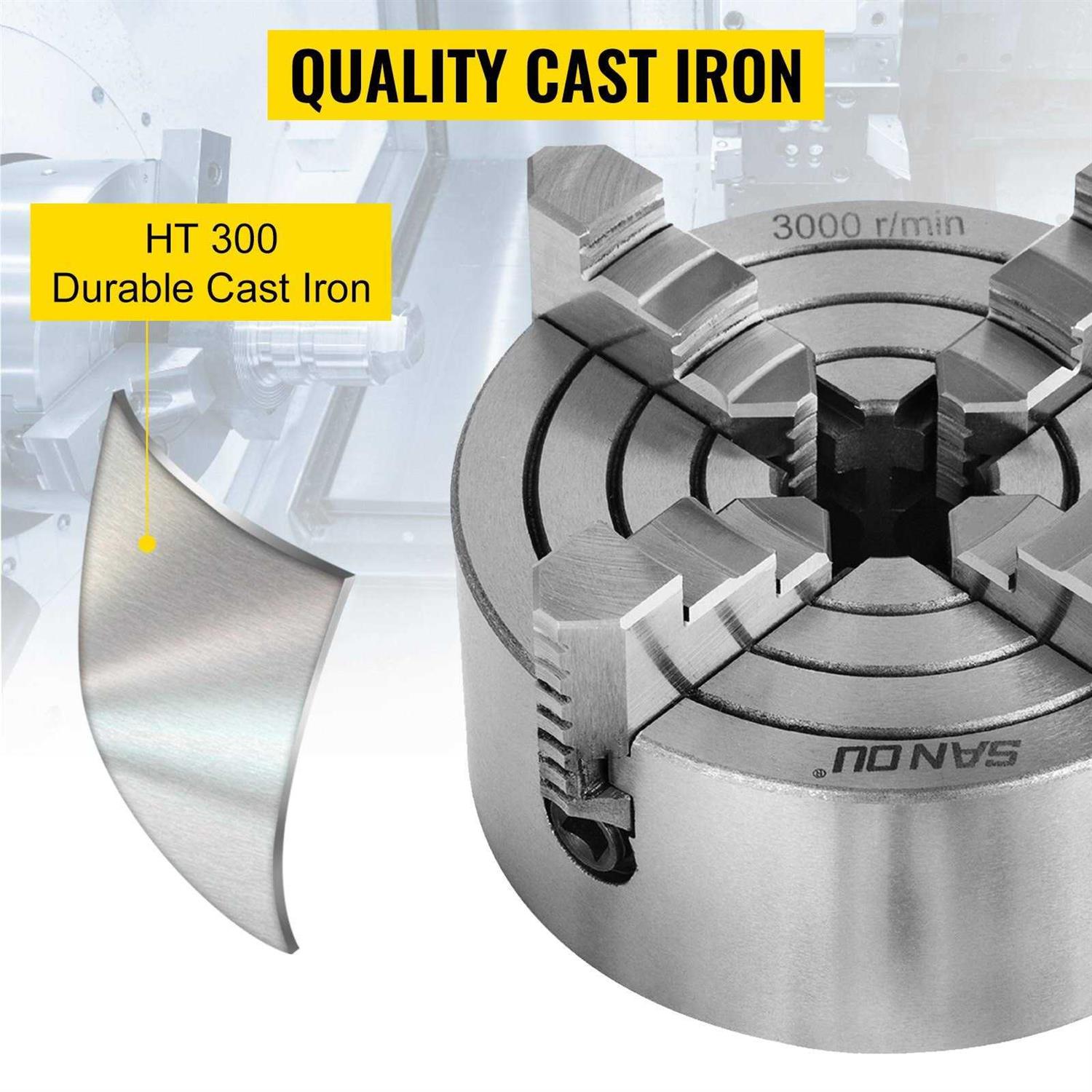 K72-125 4-Jaw Independent Lathe Chuck Large Clamping Range & Flexible Adjustment & w/ Chuck Key The 5-inch independent lathe chuck is composed of a strong cast iron body and four hardened steel jaws so that it can withstand harsh working environments. It features a wide clamping range and high precision. So you can deal with a variety of materials after fastening it with a single T handle. It is ideal for your lathe Premium Material Reversible Jaw Set Enhanced Flexibility High Precision Features & Details Premium Material: Diameter: 5 inch / 125 mm. The 4-jaw mini lathe chuck body is made of cast iron that has passed rigorous quality tests. It has high strength and toughness, compression resistance and durability, and long service life. Reversible Jaw Set: The lathe chuck is equipped with 3 inward stepped jaws that can be stepped inward or outward to hold raw materials of different shapes. The high precision design of the chuck bevel gear guarantees the accuracy of the chuck