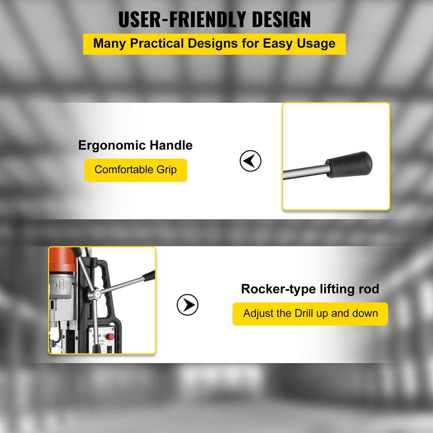 MAIN PARAMETERS-Maximum boring depth: 210 mm (8.3″). Maximum boring diameter: 50 mm (2″). 3/4 inch Weldon shank tool holder SECURED DRILLER MOTOR-110V magnetic drilling system with 1680W power. Rotary speed of 500 RPM. 2900 lb (13000N) force ensures the magnetic cutter will not move during usage 6PCS HSS CUTTER BITS-Made from high-performance high-speed tool steel. Cutting depth: 2″. Annular bit sizes: 1 PC 9/16″, 1 PC 11/16″, 1 PC 13/16″, 1 PC 15/16″, 1 PC 1″, 1 PC 1-1/16″. 1 PC pilot pin LEVER EFFECT-The annular cutter provides more leverage than hand drills, which allows even and consistent holes. Upside down operation can also be achieved APPLICATION-Magnetic cutter machine, suitable for steel erection and fabrication, welding, mining and construction, HVAC and home usages. Able to drill on any metal surface
