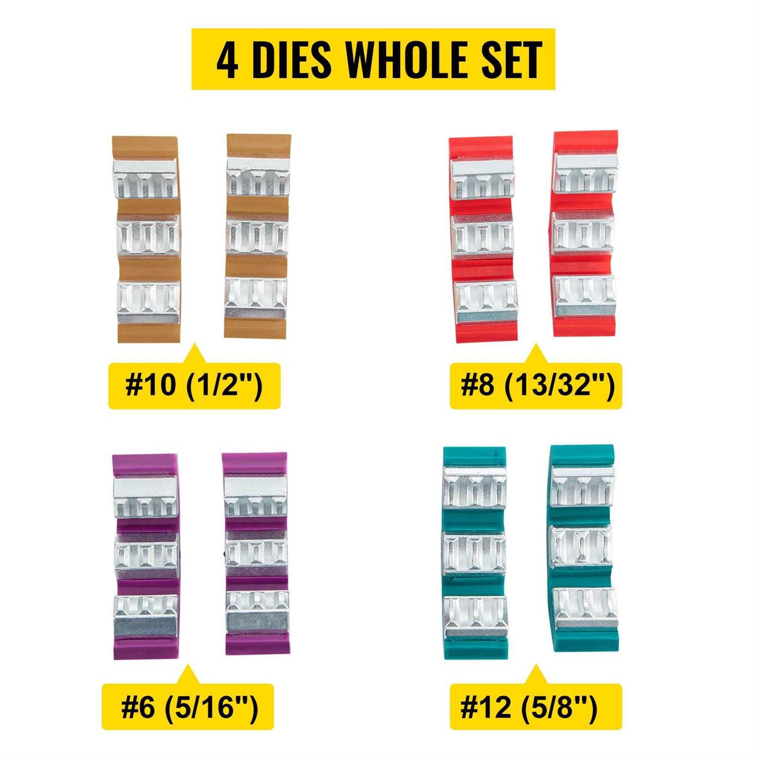 - Dies quantity: 4,Dies: #6 (5/16); #8 (13/32); #10 (1/2); #12 (5/8),Gross weight: 17 LBS,Package size: 13 x 12 x 5 inch