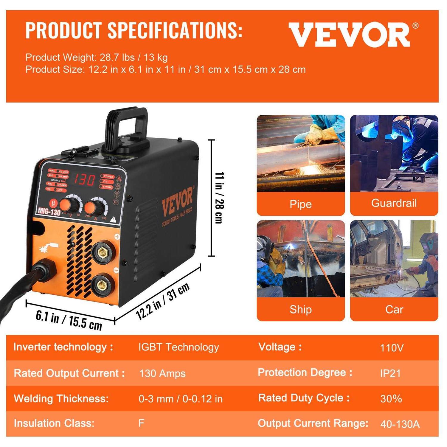 VEVOR MIG Welder 130A Welding Machine 3 in 1 Combo MMA/MIG/LIFT TIG Welder Machine Flux Core Welder Mig-130 Portable Welding Machine for Carbon