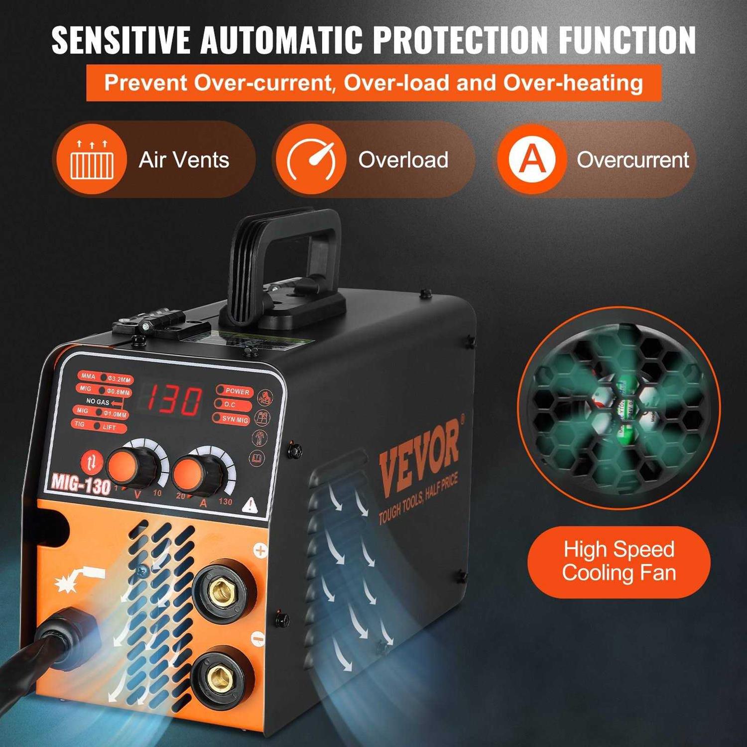Outstanding Performance: Rated output current: 130 Amps. Output current range: 40 – 130 Amps. Prepare to be dazzled by the stable arc, little splash, good shaping, efficient welding, and 3-in-1 welding modes (MIG, LIFT TIG, and MMA). Wire Feeder & IGBT: The application of IGBT technology enhances the welding machine’s reliability. Feeding speed adjustment range: 8.20 – 42.65 ft/ min. Welding Thickness: 0-0.12 inch. Versatile 3-in-1 Welder: Seamlessly switch between MIG, MMA, and Lift TIG modes to meet various welding requirements. Adjust the current to weld carbon steel, stainless steel, or thicker materials. Ideal for DIY projects, outdoor repairs, rusted metal, farm equipment, and road machinery. Included with function switching buttons and a current-voltage control knob, the intelligent digital display makes the operation easier for you. Even beginners can use it easily. The incorporated cooling fan also enhances cooling efficiency during extended welding operations.