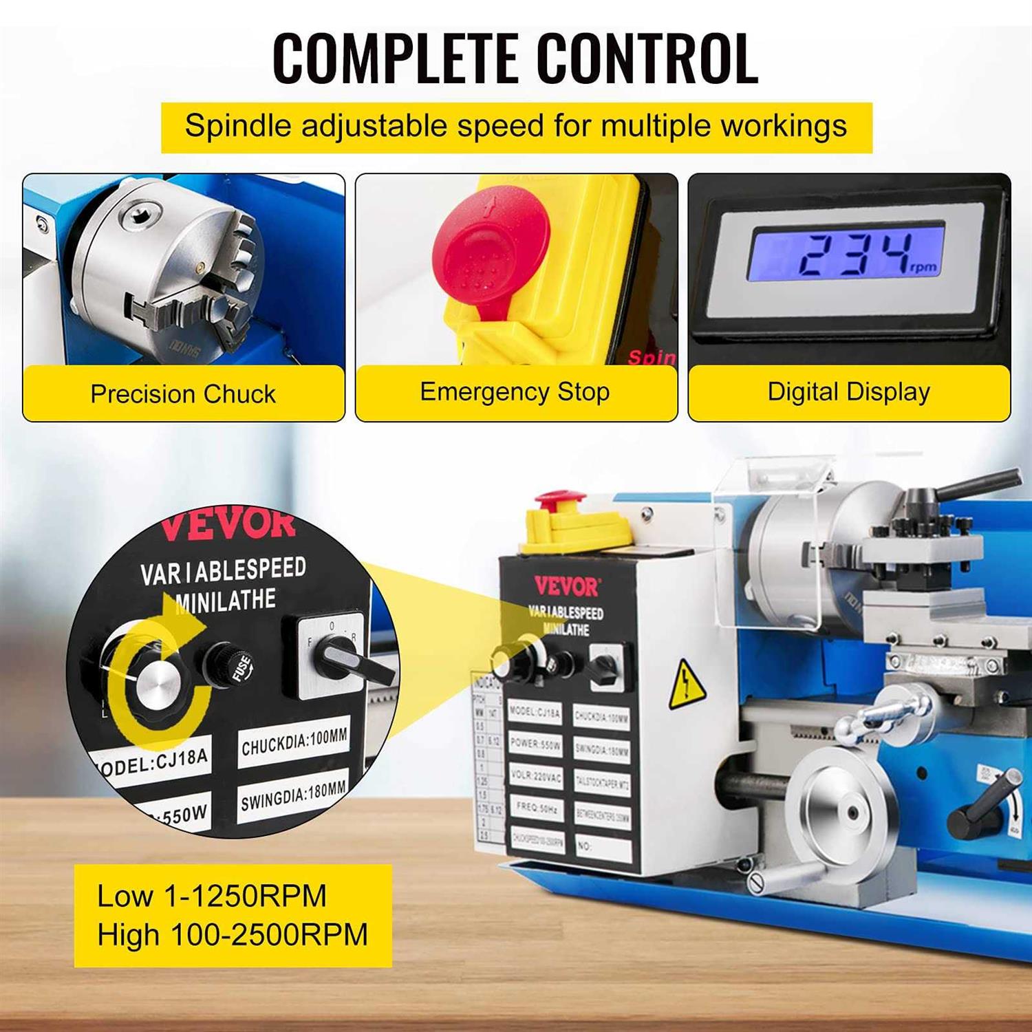Precise Engineering: Ideal for professionals, this power metal lathe’s high-precision 4-inch 3-jaw chuck handles both square and round objects with equal aplomb. It’s especially suitable for jobs requiring high accuracy, such as threading. Large Working Capacity: This metal working lathe cranks out 550W and handles small to medium projects. It provides a 7.09″/180 mm swing over bed and 13.78″/350 mm center distance so that you can manage more extensive projects. Upgrade Design: This small metal lathe uses metal gear instead of a nylon one. Aluminum handwheel can increase service life. Automatic power-off protection switch to make it safer. An extra LED lamp can help you finish processing in places with insufficient light. Complete Control: The lathe’s rotational speed can be set from 50 to 2500rpm and monitored by the digital display; the well-crafted head and tail stocks, large through-hole, and 4-way tool post also contribute to providing greater control of your work. Professional Construction: 4-way quick change tool post can install 4 standard turning tools at the same time. You can adjust tool post forwards/backward by turn blade adjusters with accurate scales clockwise/anticlockwise.