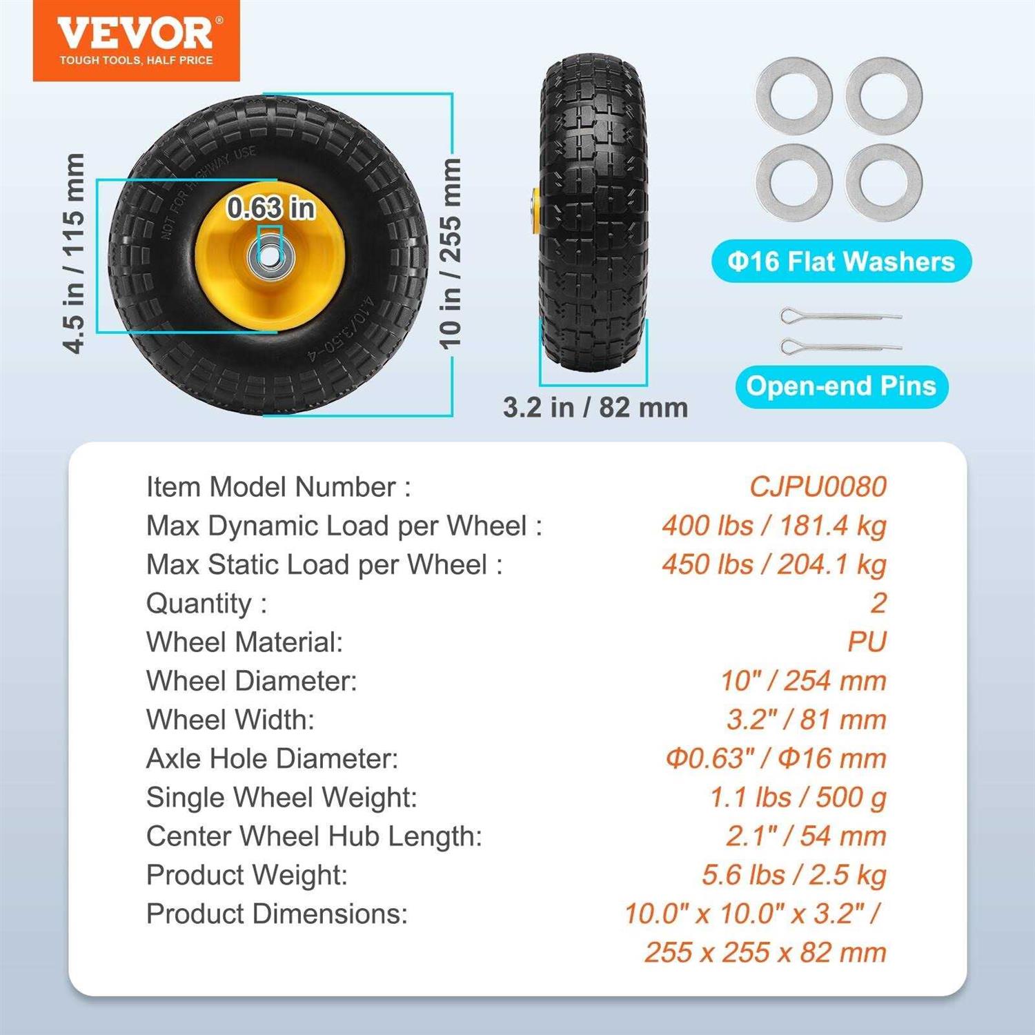 VEVOR Solid PU Run-Flat Tire Wheel 10″ 2-Pack 400 lbs Dynamic Load 450 lbs Static Load Flat Tubeless Tires and Wheels for Hand Truck Utility Cart