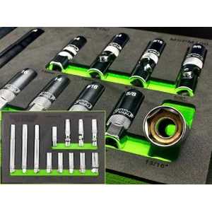 Designed to remove and insert spark plugs with ease using magnetic rings to hold plug in socket while installing or removing it. Set is made up of 12 magnetic sockets with a satin finish, all laid in a black and green EVA foam with labeled sizes. Each socket is conveniently knurled to allow the tech to turn by hand if needed.