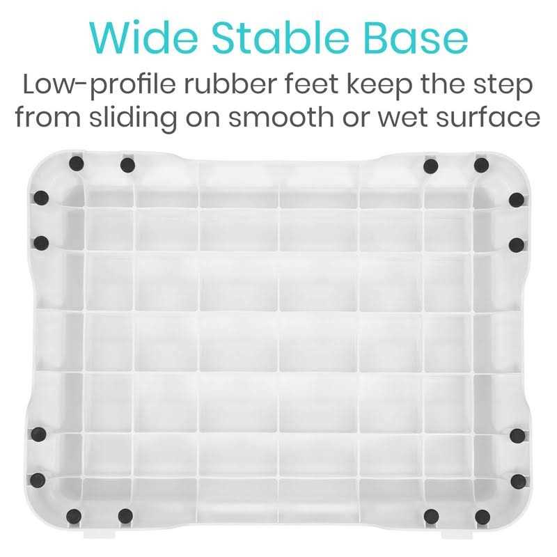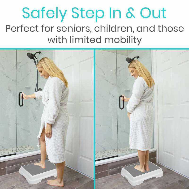 Safely step in or out of the tub with a slip-resistant bath step. The extra-large platform is perfect for seniors, children and those recovering from injury or surgery. The extra large platform is covered with a nonslip, textured rubber for additional stability and security while stepping in or out of the bathtub. Measuring 16 by 19.5, the platform provides secure footing for any individual. Providing an extra four inches in height, the bath step has low-profile rubber feet to keep the step from sliding on smooth or wet surfaces.
