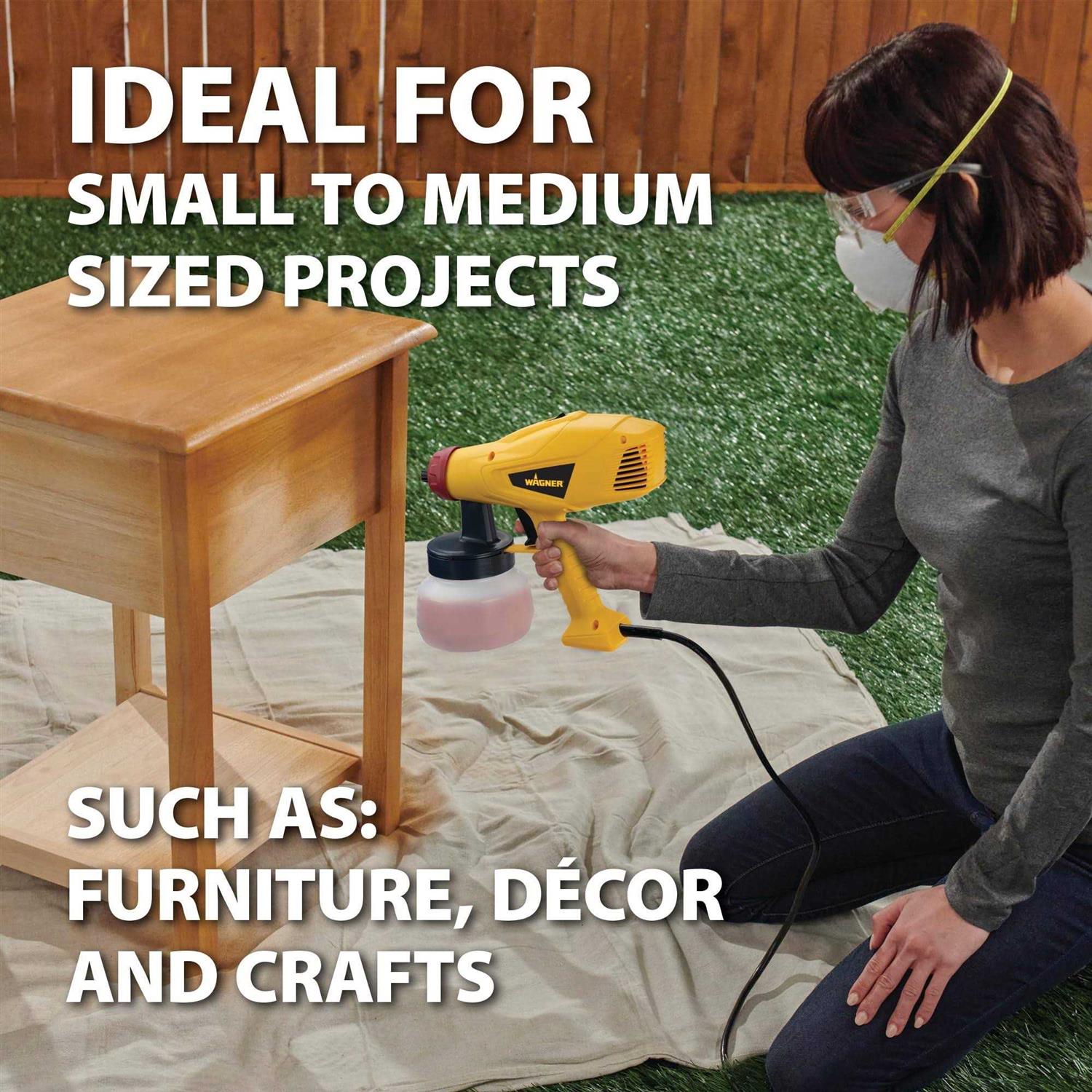 The Control Spray QX1 paint sprayer by Wagner is a compact spray gun that’s great for those who are new to paint sprayers and want to step up from brushes or spray cans. It makes it easy to spray a great finish on small to medium sized projects such as furniture, décor, crafts and more. It applies a smooth, consistent finish with no brush marks and offers more control and efficiency than the average brush or spray can. It can also be used with a variety of materials, including light bodied stains, sealers, urethanes, varnishes, enamels, and thinned craft paints like milk and chalk paint. The sprayer is easy to use and features multiple adjustable settings to suit your project needs. There are three different spray patterns (horizontal, vertical and round) to provide greater project flexibility. You can also adjust the volume control knob to increase or decrease material output to match painting speed and project size. When you’re done spraying, the Control Spray QX1 sprayer is simple to clean so that you’ll be ready for your next project. Simply rinse the plastic parts with soap and water when using water based materials or mineral spirits for oil based materials.