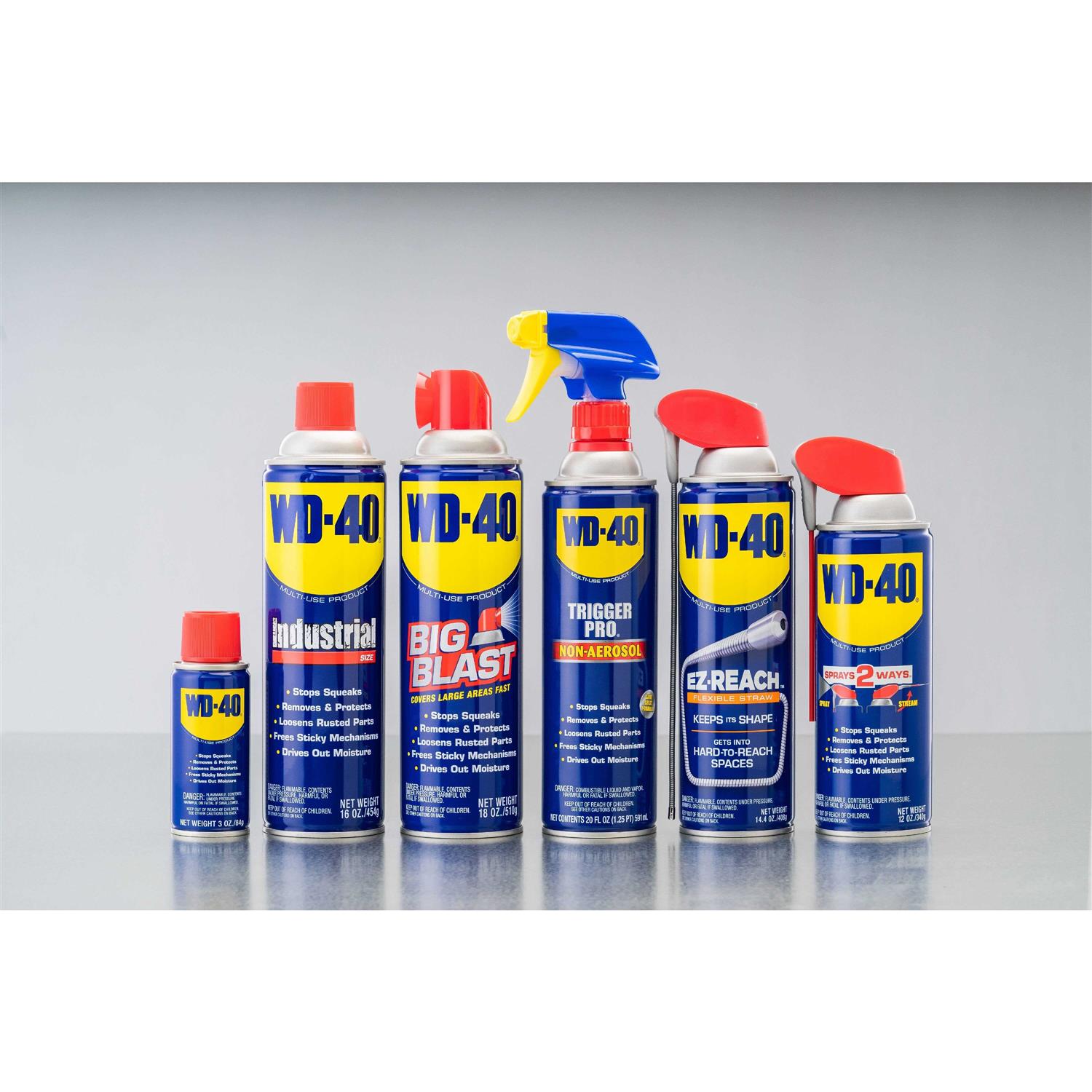 Durable spray trigger gives you a controllable spray pattern, less mess, and easy disposal. This multi-purpose lubricant helps protect your tools, so you always hit the mark WD-40 Multi-Use Product has five functions. It lubricates, penetrates, protects, removes, and displaces moisture. It does not contain silicone, kerosene, water, graphite, or chlorofluorocarbons (CFCs) Lubricating spray can be used on alloy wheels, engines, hedge trimmers, hinges, bikes, and all the nuts and bolts you throw its way. With long-lasting performance and protection, it will get the job done Truly a “toolkit in a can.” This formula has been around for 65 years and has over 2,000 different uses Safe on rubber, metal, wood, and most plastics (avoid use on polycarbonate and clear polystyrene plastic). Use it on your bike to prevent rust or prevent mud from sticking, or on sports equipment like golf clubs and metal baseball bats Comprehensive action against rust – Lubricates and protects. Leaves a thin protective layer that prevents future corrosion. With over 2,000 different uses, WD-40 Multi-Use Product is ideal for nearly any job. WD-40 Multi-Use Product’s lubricating ingredients are widely dispersed and hold firmly to all moving parts.