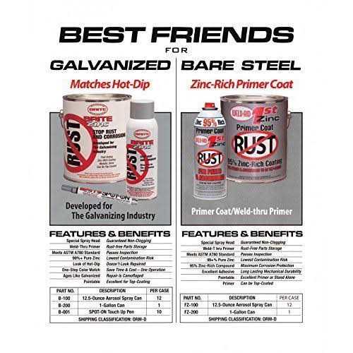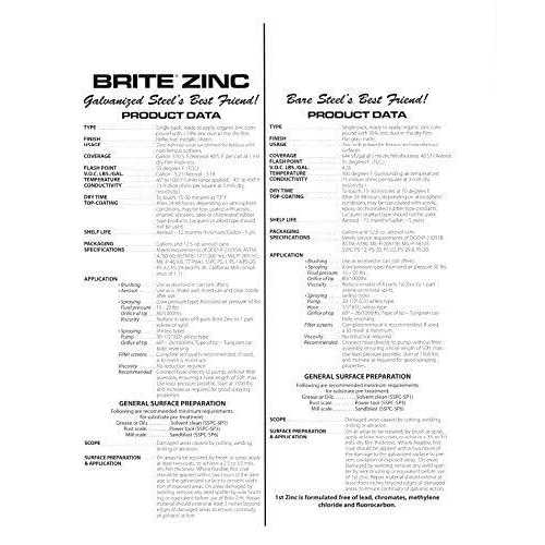 Brite Zinc is designed for the touch up and repair of galvanized metals like chain link fencing, roofing, farm equipment and other any other fabrication application for maximum protection against rust. Great for touching up galvanized surfaces after welding to re-establish the zinc coating. Unlike most zinc-rich coatings, Brite Zinc can be used effectively as a one-step coating process (primer and topcoat combined) matching the shiny look of freshly galvanized steel while providing a 69% zinc rich surface. Also great on bare steel to prevent rust.