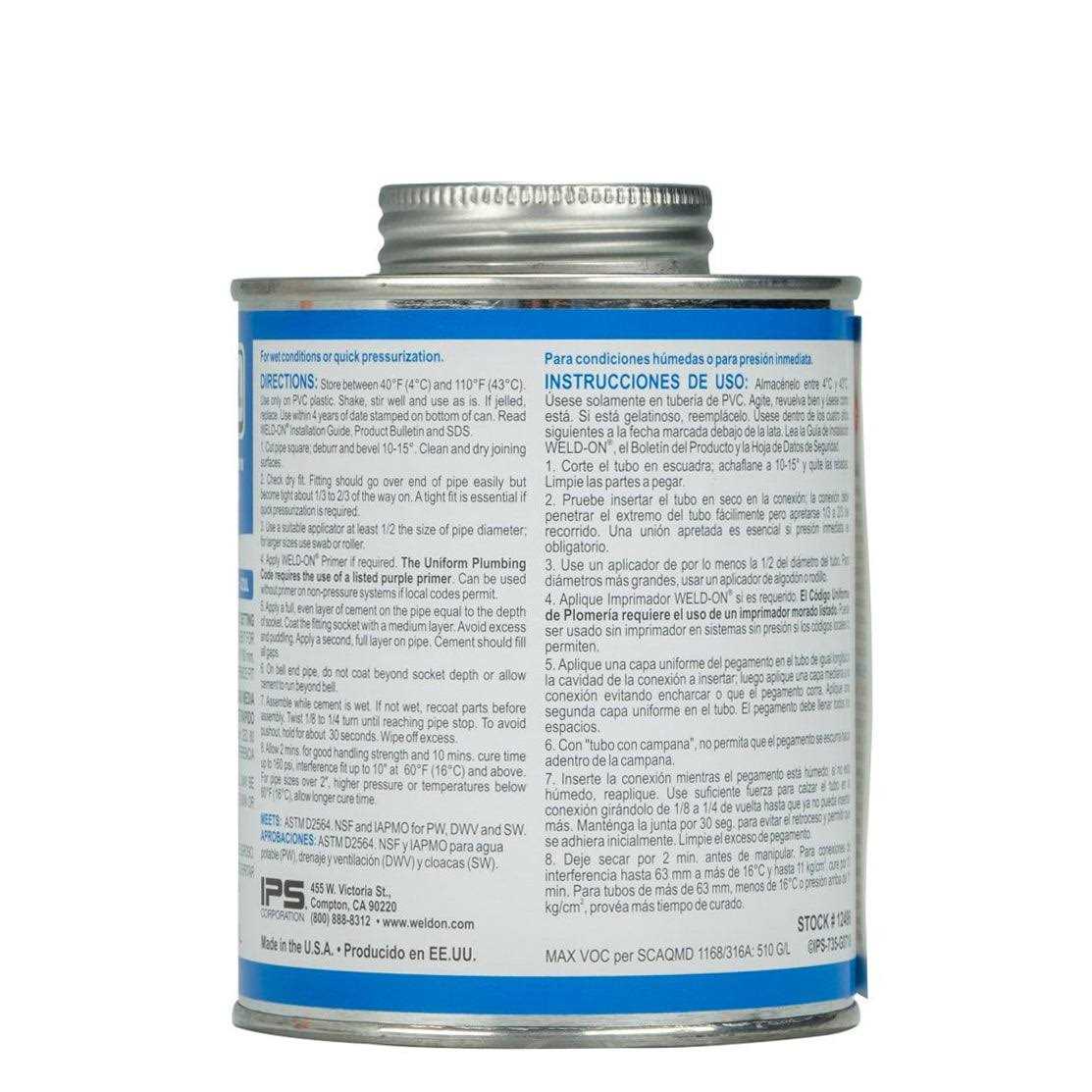 Contact Cements by IPS. Details: Tackle even the toughest, wettest plumbing conditions with Weld-On 735 Wet ‘N Fast PVC Solvent Cement. Featuring an extremely fast set time, this PVC pipe cement excels in wet environments and in situations where quick pressurization is desired. It creates a deep fusion between pipes and fittings with interference fits up to 6 inches in diameter (and up to 4 inches for Schedule 80). It is suitable for all classes and schedules of rigid and flexible PVC, including foam core DWV (drain, waste, and vent). The unique Wet ‘N Fast formula was designed specifically for plumbing systems but may also be used in irrigation, pool, spa, and other applications. Medium bodied, extremely fast setting, low VOC PVC cement for all classes and schedules with interference fit through 6″ (160 mm) diameter, schedule 80 through 4″ (110 mm) diameter. Plumbing quality cement for wet conditions and/or quick pressurization.