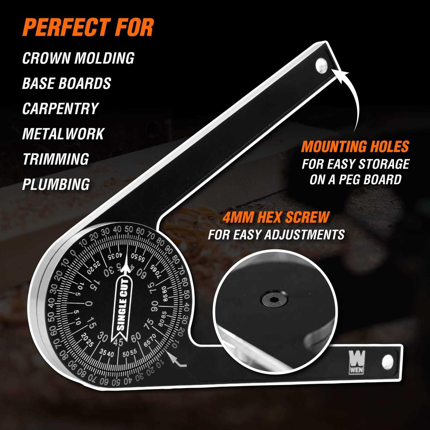 Remember when you could measure any angle? Set your miter saw cuts precisely and accurately with the WEN Laser-Etched Miter Saw Protractor. This helpful tool helps craftsmen and woodworkers alike by providing accurate readouts for crown molding, trim work, and a variety of other carpentry applications. The precision CNC-machined aluminum alloy body combines with the laser-etched easy-to-read scales for maximum durability and accuracy during operation. Use the outer scale for taking single cut measurements and the inner scale for miter cut measurements. Its about time you knew your angles with the WEN Miter Saw Protractor. Remember when you could transfer readings directly to your miter saw? Remember WEN.