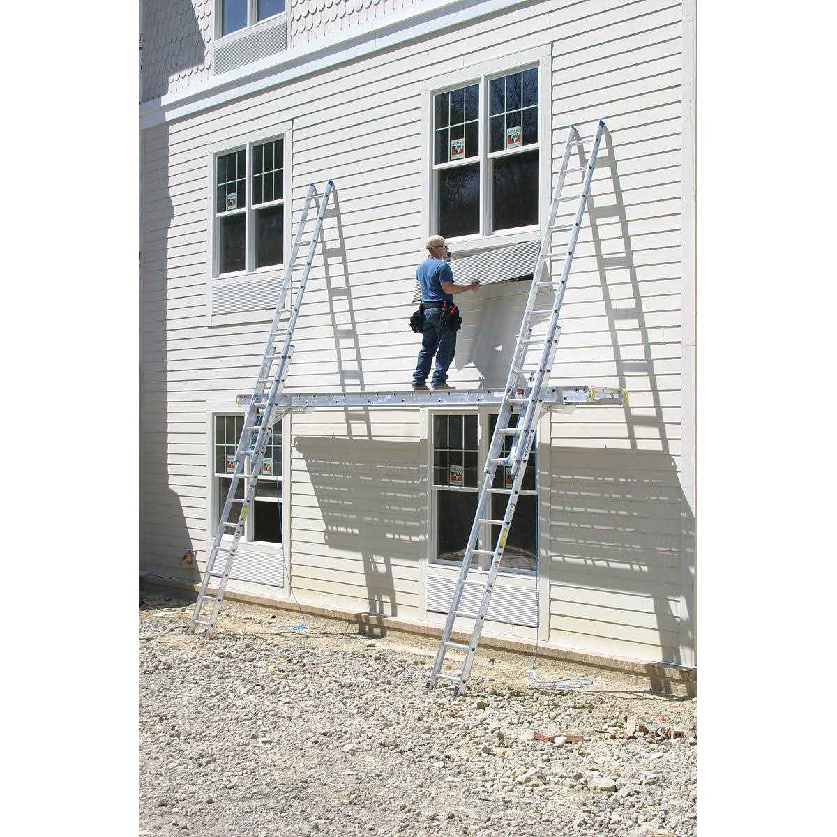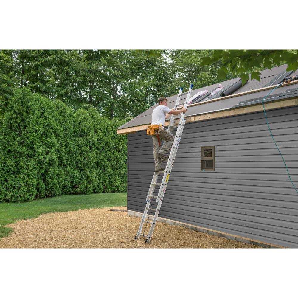 The Werner 40-Foot Type 1 Aluminum Extension Ladder gives you the reach and stability you need to work high off the ground. It earned ratings from the Occupational Safety and Health Administration (OSHA) and from the American National Standards Institute (ANSI) for safety at home and on commercial work sites. The heavy-duty extension ladder extends from a closed height of about 20-feet to an extended position of 40-feet. ALFLO rungs provide a TWIST-PROOF hold on the supports, so you maintain stability while the ladder is fully extended. TRACTION-TRED rungs help to keep your feet in position as well. The bottom of the 40-foot extension ladder has SHU-LOK spurs that maintain the ladder’s position against walls without slipping away.