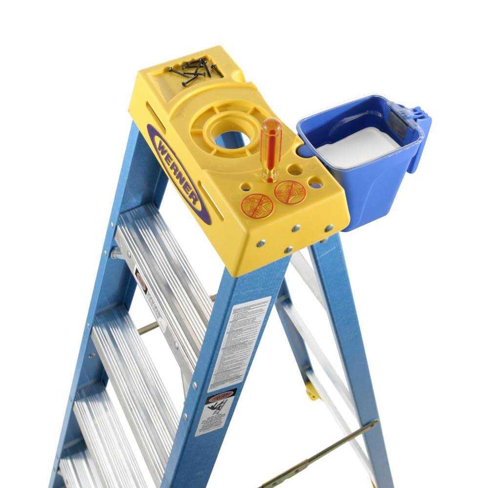 The 6006 fiberglass 6 ft step ladder features a HolsterTop with the Lock-In System that allows you to customize your ladder top. The system secures tools from falling while keeping them handy while working increasing productivity on the job. The tops also hold tools and have a sturdy paint can hanger on the back side. The external spreaders are PINCH-PROOF and the TRACTION-TRED steps are slip-resistant. This step ladder has a duty rating of 250 lb and offers the EDGE bracing for enhanced strength and increased protection against damage. Fiberglass rails are non-conductive for working near electricity.
