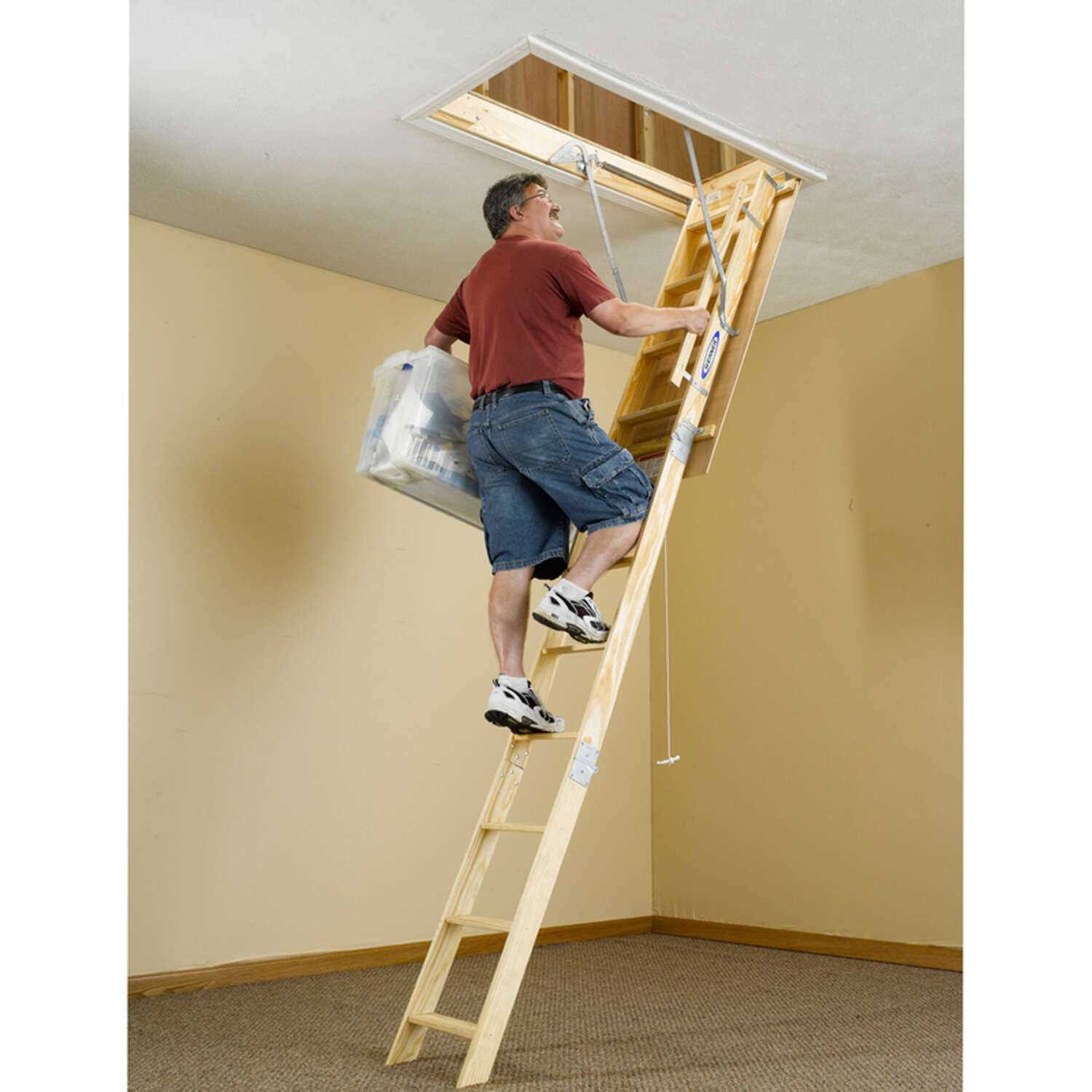 The W2510 wood attic ladder has a duty rating of 250 Lbs. and comes fully assembled and ready to install. Full wrap-around door hinge minimizes heat loss. The quality door is ready for staining or painting. The pull string eases the opening and closing. Hinges butt metal to metal to maintain ladder rigidity. Counter-balance mechanism eliminates sag and springiness.