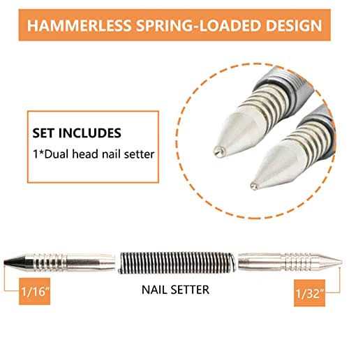 Professional Hammerless Technology: Made of heat-treat hardened steel, Spring-loaded design, you can deliver 3500PSI of impact striking force without the need for a hammer, one replace two, make your work more efficient!. Double Ended: 2-IN-1 nail set covers the most popular nail sizes for finishing jobs, 1/32head for smaller pin nails and 1/16for larger nails. Safe & Easy to Use: Requires no bulky or blunt objects to be swung, working in areas a conventional hammer might not reach, perfect in tight spaces, does not damage the surface or trim. Wide Application: Finishing nails and marks for wood, metal, glass surfaces. Use it as a screw hole starter and use the nail set on small brads, making these tools essential for any carpenter or finisher.,,WHLLING
