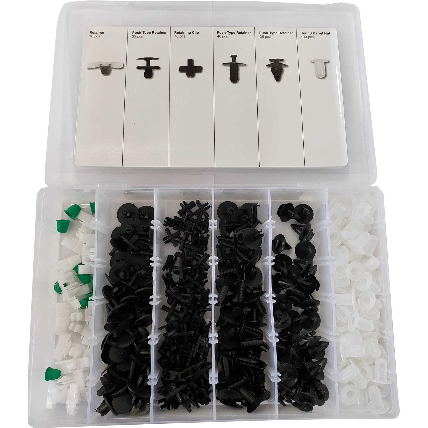 All the essential retainers, fasteners, and clips needed for the auto body panels on BMW vehicles. 290 piece set of assorted clips for BMW vehicles. Includes convenient organizer with illustrated insert for a speedy part reference. These parts are made of OEM quality nylon for OEM installation, fit, and finish.
