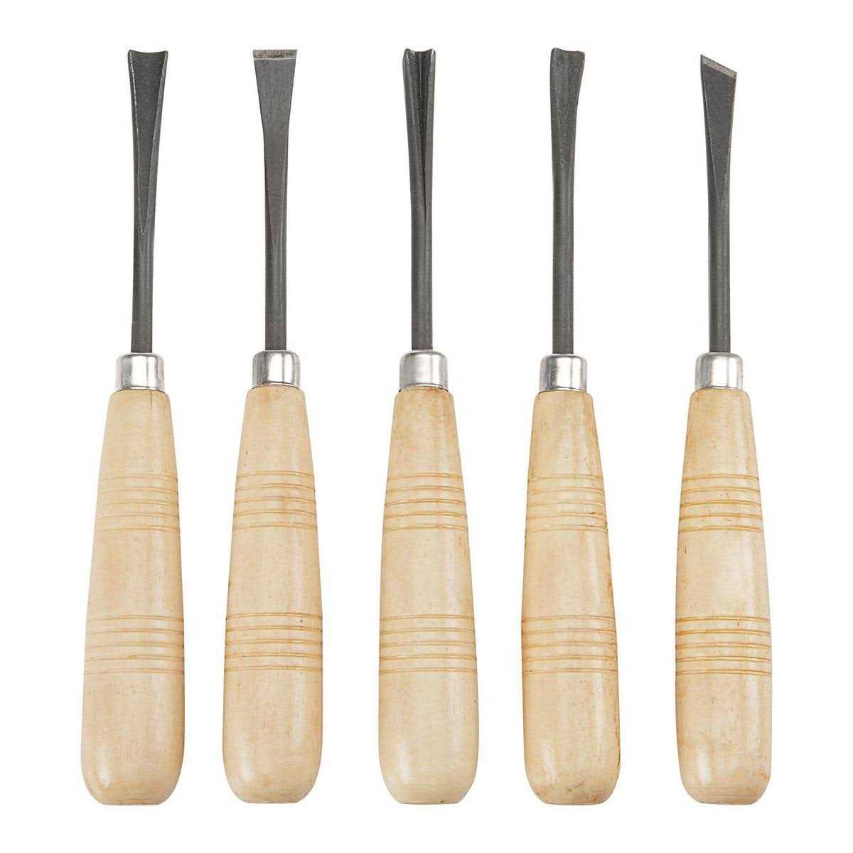 The chisels in this 5 piece set are crafted of heat treated high carbon steel for strength and durability. Machine turned hardwood handles are easy to hold and don’t slip in your hands, allowing for comfortable operation. The set includes v-gouge, shallow gouge, deep gouge, skew, and straight chisels that are ideal for precise, detailed woodcarving projects. The flat chisel is handy for general woodworking and carving.