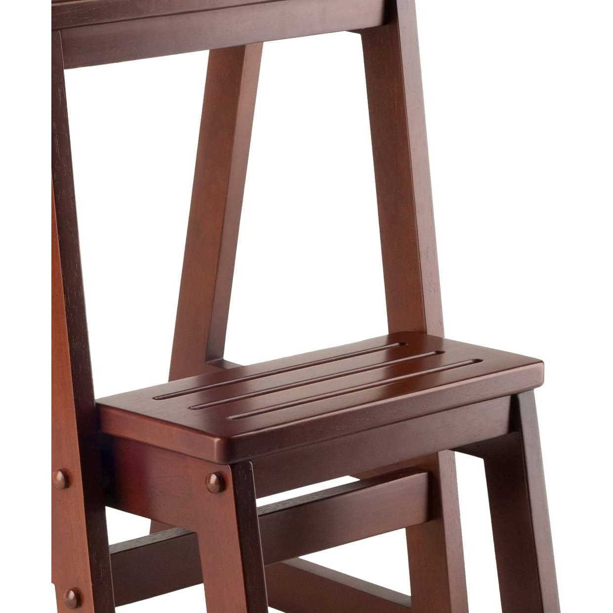 Every home needs a step stool. From a little tyke’s toothbrush way up on the bathroom sink to those holiday dishes stored on the top kitchen shelf certain places are just hard to reach alone. This solid/composite wood stool from Winsome Wood is attractive compact and easy to tote around. The two-tier design features a narrower bottom step for quick up-and-down jobs and a wider top step for higher elevation reaches. Both steps are cut with slender slats for traction and rest securely on a sturdy wide-base frame. To store or transport this handy helper simply fold in the bottom step. The stool has a rich Antique Walnut finish and measures 18-1/2 inches wide by 15 inches deep by 21-1/2 inches high. It supports 250 pounds. Assembly is required.