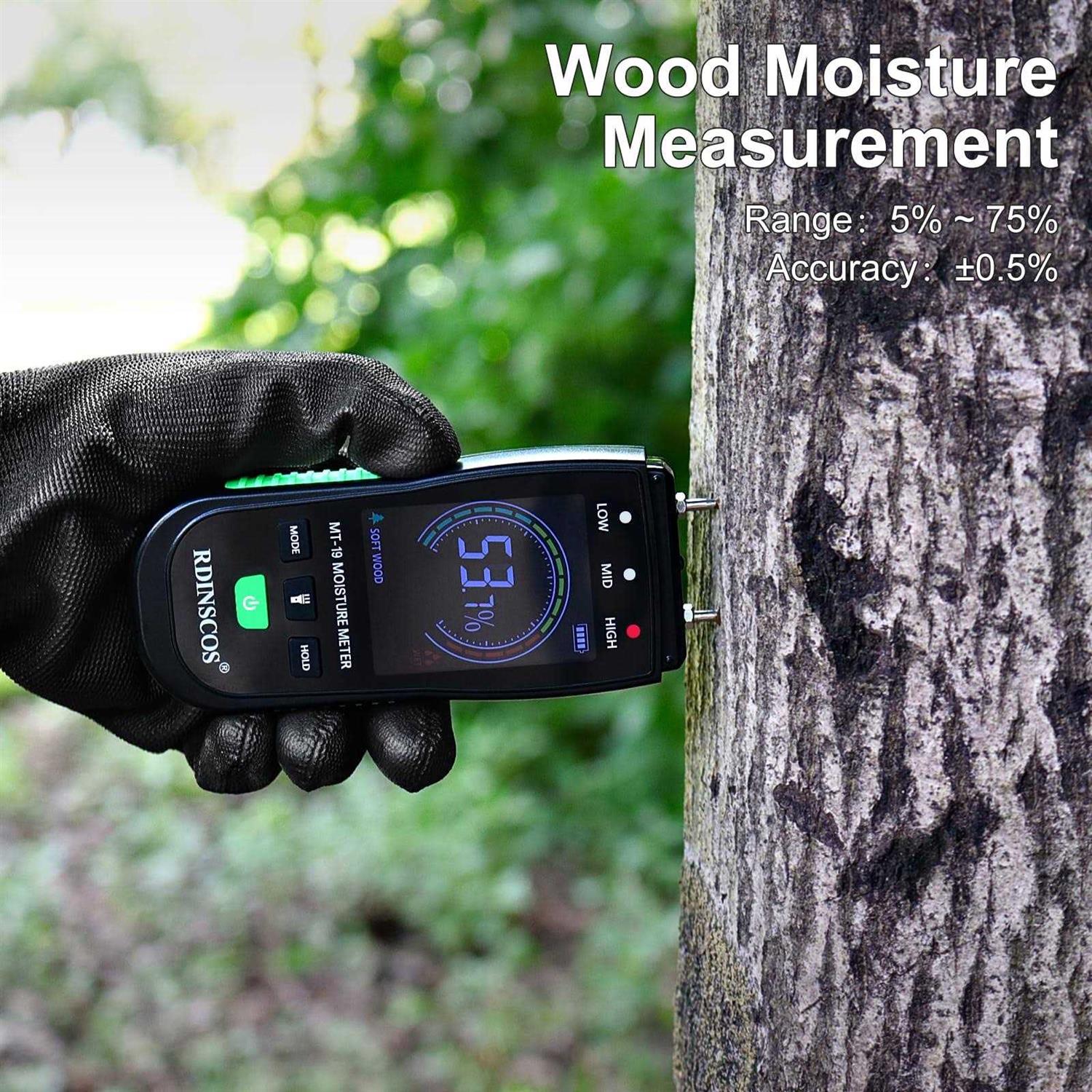 QUICK ACCURATE MEASURINGMT19 Wood moisture meter can quickly tell us the level of remediation and keep our family away from black mold. High levels of dampness wood or building that go untreated are the leading cause of harmful fungus growth in our home. WATER-LEAK DETECTORTo find the dampness in the wood or drywall is our first step. Continuously check and test and find the suspicious water stains around the house so that you can determine whether the area is wet or has already dried. USER FRIENDLY, SIMPLE TO UNDERSTANDMT19C moisture detector designed with Large easy-to-read Backlit LED screen. The multi-functional moisture tester has sturdy, hand-friendly shape and anti-slip grips that let you take multiple measurements in comfort. MEET ALL YOURS NEEDSDESIGNED WITH WOOD, BUILDING and PAPER MATERIAL TO MEET ALL YOUR NEEDS. RDINSCOS moisture tester is ideal to use in woodworking, building construction, agriculture restoration and floor-laying. such as hardwood flooring, cabinets, furniture, lumber, slats, beams, plywood, paneling, conglomerates, window frames, forestry wood, rolled products, building materials and more can be measured. TipsTo ensure accuracy, it is advisable to insert the pins deeply into the wood when using them. If the reading is 0, it indicates that the wood is extremely dry, acting as an insulator and not conducting electricity. WHY CHOOSE RDINSCOSRDINSCOS tools are known for their affordability, quality and reliability. If it lets you down, well replace it. No questions asked.