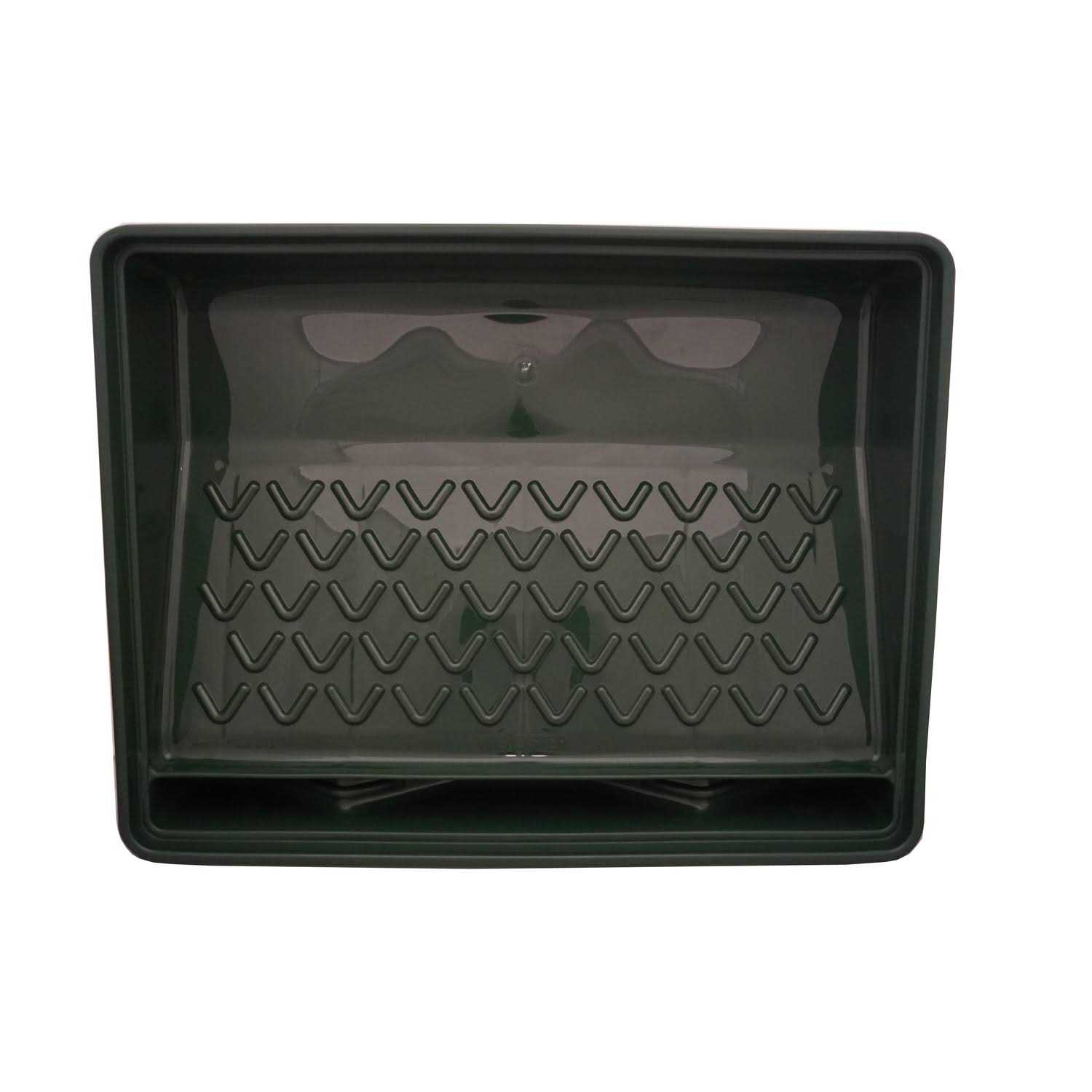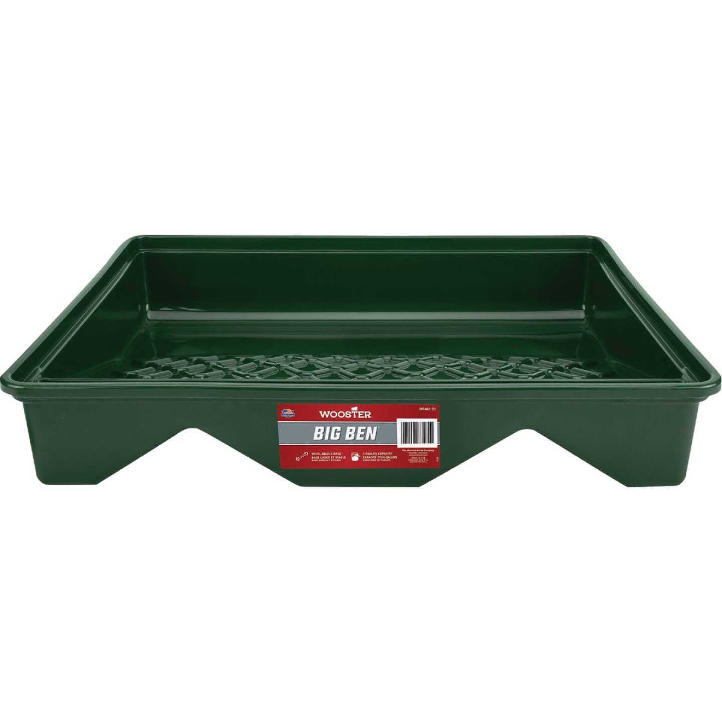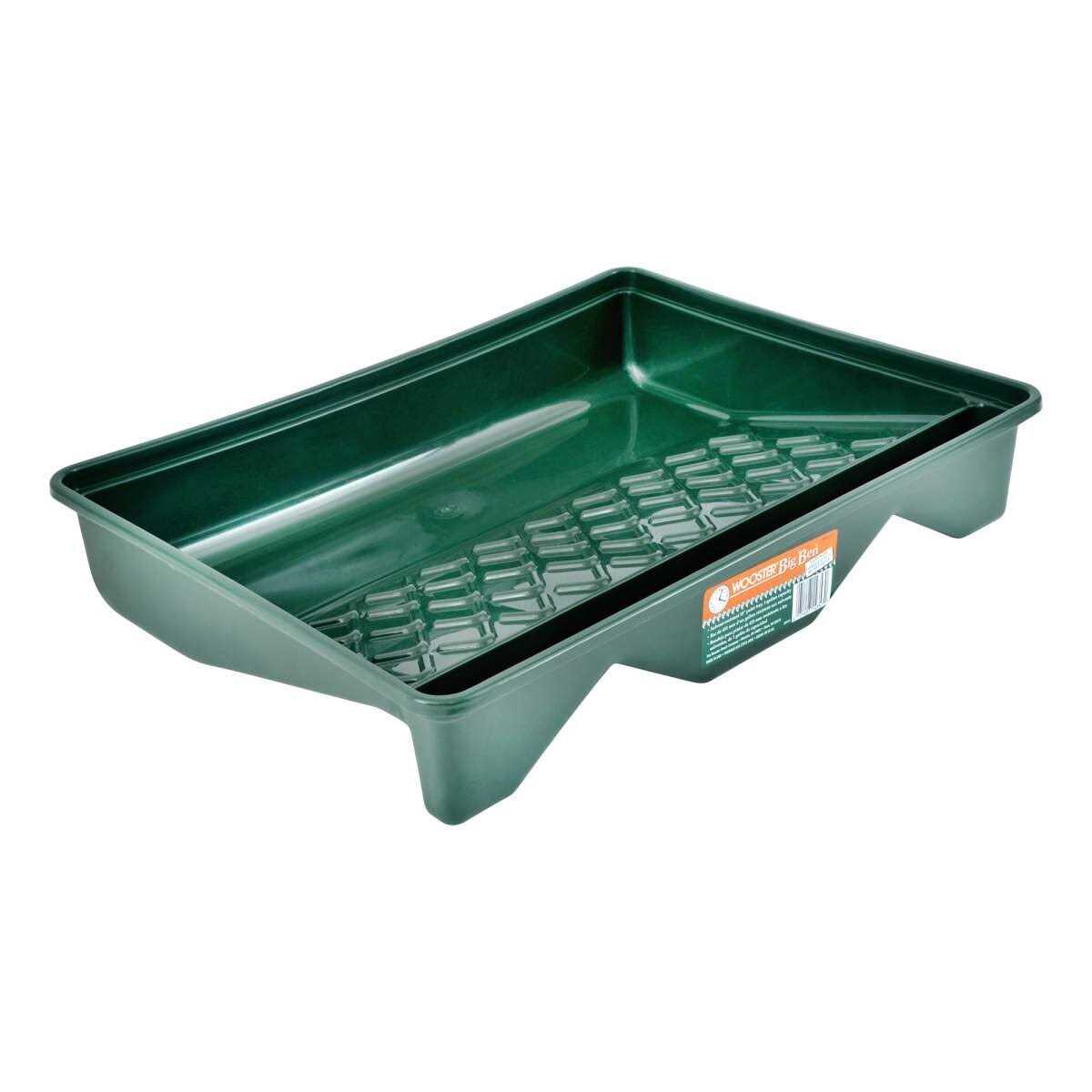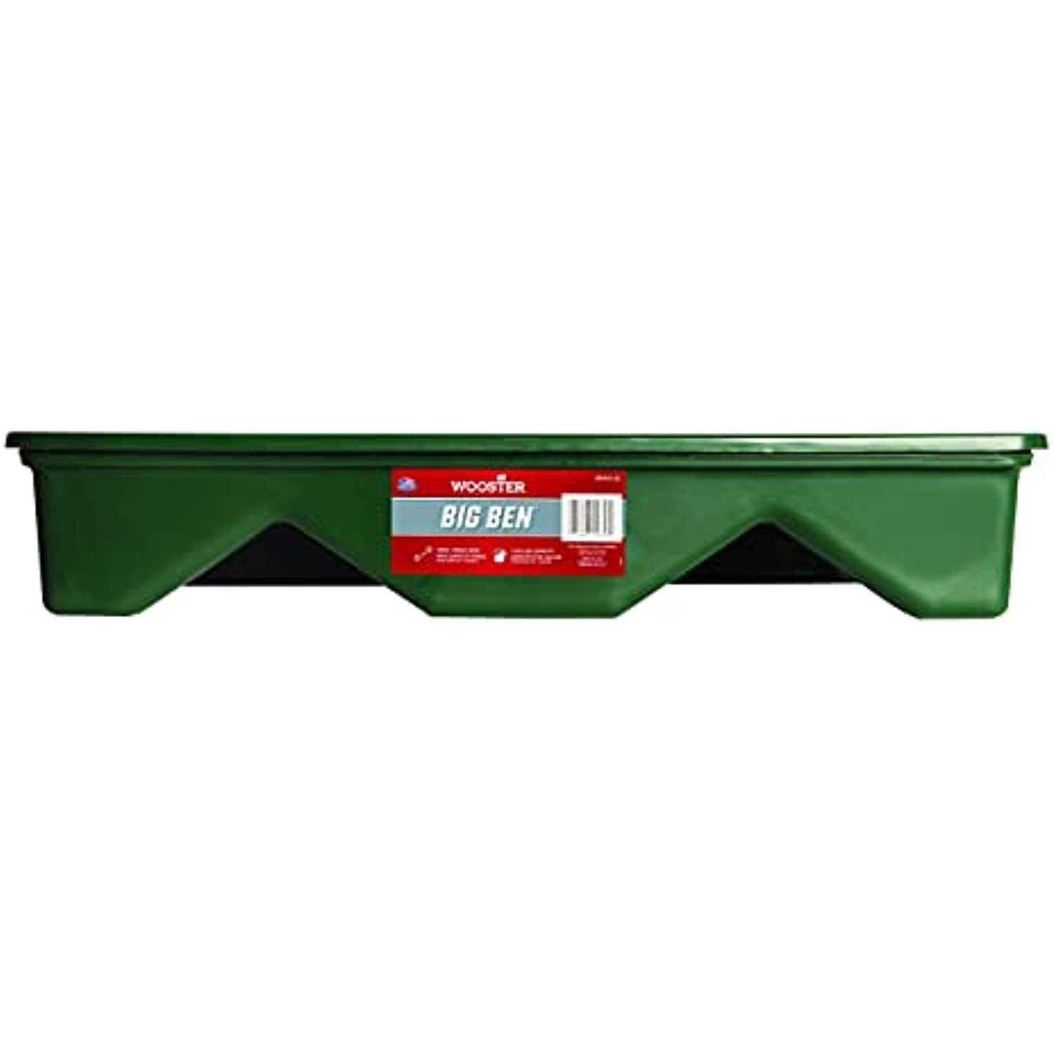 Wooster Big Ben Roller Tray extra large, heavy duty roller tray with and internal width of 21 inches and will take all roller sleeves up to 18 inches wide. Large roll off area and a 3.5 Litre paint reservoir ideal for painters, decorators and contractors. Made from green polypropylene resists solvents and paint buildup with handy edge compartments hold brushes and tools. Dimensions 16 inches (405mm) long x 21 inches (533mm) wide x 4 (101mm) inches deep.