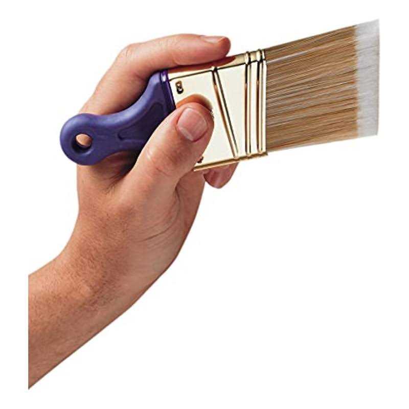For all paints (latex, acrylics, and water-based stains). White nylon/gold polyester, chisel trim. Brass plated steel ferrule. Flexible purple Shergrip 2-1/4″ handle adds maneuverability in tight spaces.