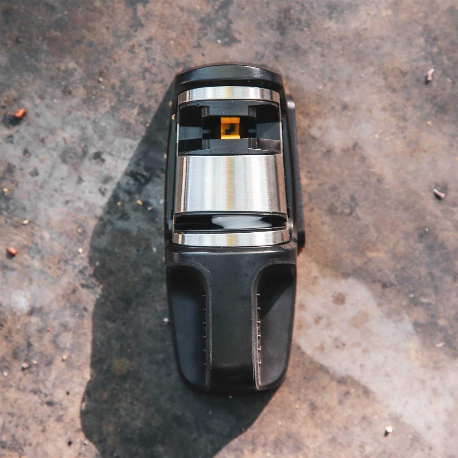 The Work Sharp Kitchen Edge Knife Sharpener is a fast, easy, and effective way to sharpen your kitchen knives. Convex Carbides quickly restore a sharp edge, while the Ceramic Wheels hone the edge back to a factory level of sharpness. The contoured base feature allows the sharpener to be used flat on your countertop or securely on the edge to provide two levels of sharpening control. The soft rubber grip and base provide a safe and comfortable sharpening experience. Compact size easily fits into your kitchen drawer.