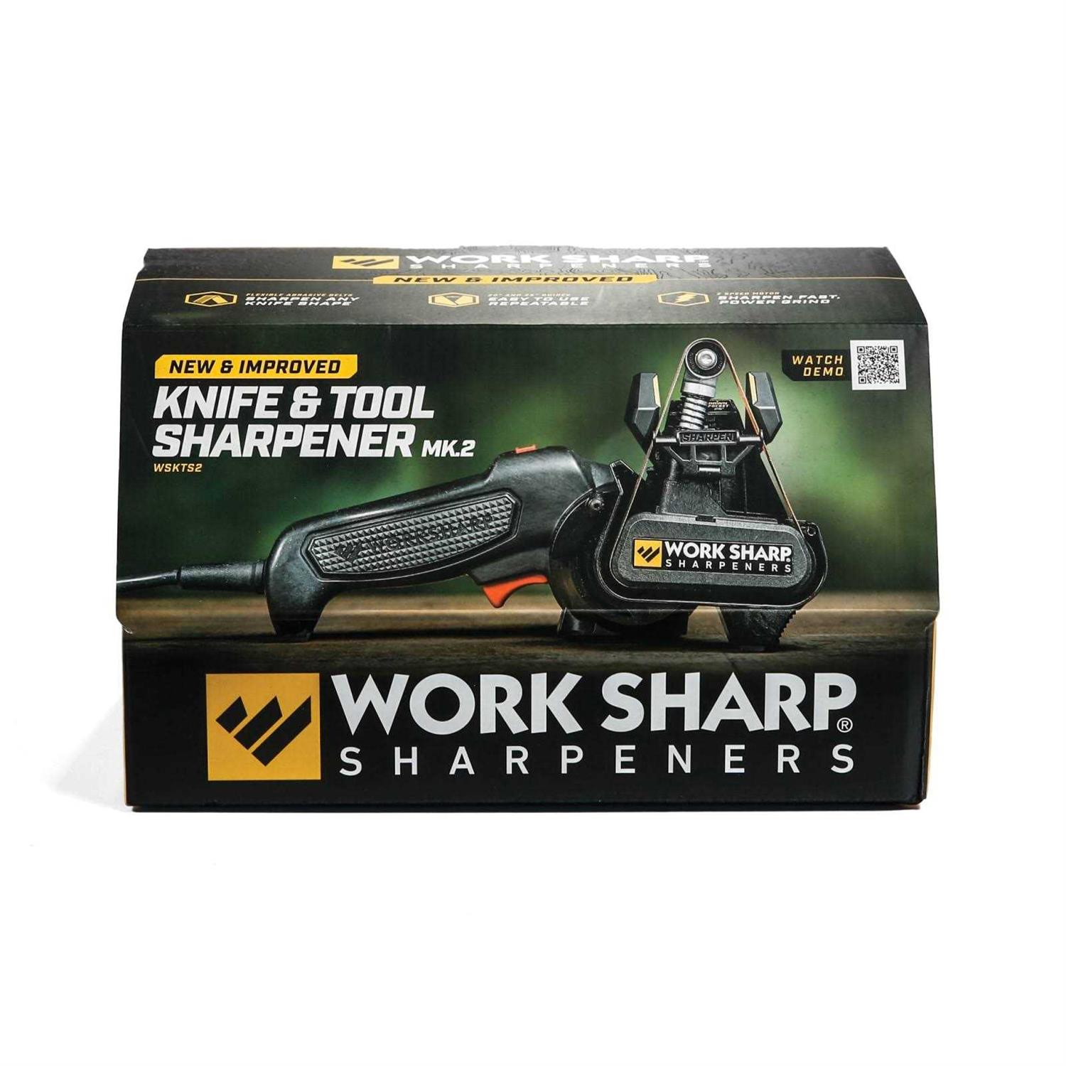 The Mk.2 Knife and Tool Sharpener is an improvement upon the original Work Sharp Knife and Tool Sharpener; which was the first knife sharpener designed to sharpen every knife you own. Building on that success the new Mk.2 provides even more sharpening benefit for the avid knife user. Using 1/2in x 12in flexible abrasive belts in coarse, medium and fine grits, the sharpener is able to sharpen not just straight bladed knives, but also curved knives, tanto blades, filet knives, serrated knives, gut hooks and virtually any other shape of knife blade. The Mk.2 Knife and Tool Sharpener provides an improved precision sharpening guides to ensure that you get the proper angle every time. Quickly toggle between the 25 angle for hunting and outdoor knives and the 20 angle for thinner blades and kitchen knives. The New Sharpening Guide also provides an Edge Guide to support the blade during the entire process making it more precise and repeatable. New two speed power delivers a low speed for more control when sharpening a knife, yet still provides all the power you need for heavier sharpening and grinding tasks on tools like lawnmower blades, axes and other common lawn and garden tools. Speed control is ergonomically placed within reach to make speed adjustments fast and easy when sharpening. This combination of speed control, precision guide and flexible abrasive belts let you sharpen your blades to hair popping results with speed, ease and repeatability. This is the fastest and easiest way to get your knives as sharp as you need them to be. Stop tolerating dull knives and time consuming sharpening methods! Professional knife makers use flexible belts to put a razor sharp edge on their blades, and now you can have the same technology at home to use any time your knives get dull. You may already have other sharpening methods, but never before has a knife sharpener been able to quickly and easily sharpen this broad range of knives to such extremely sharp results.