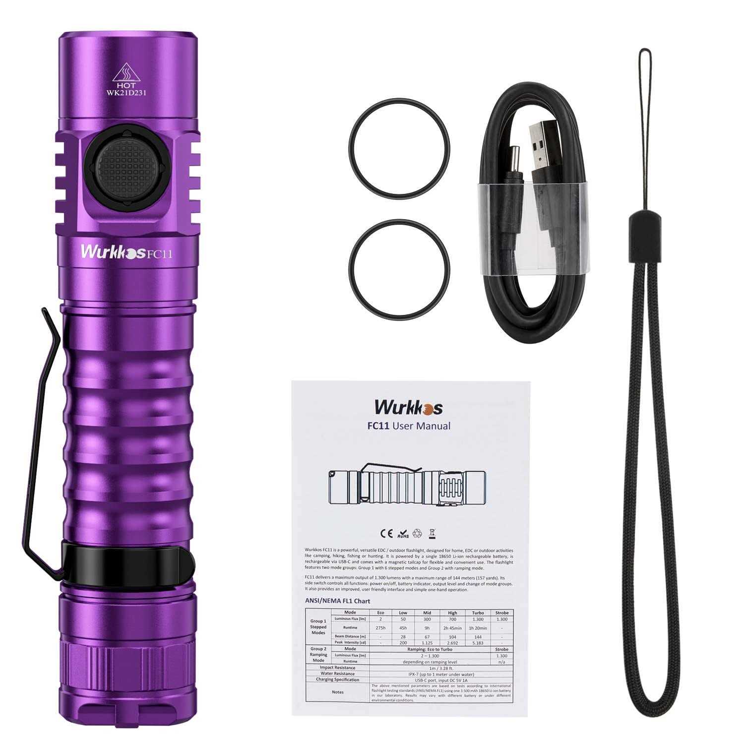 Wurkkos FC11 Rechargeable LED Flashlights Max 1300Lumen High 90CRI EDC USB C Charge,IP67 Waterproof